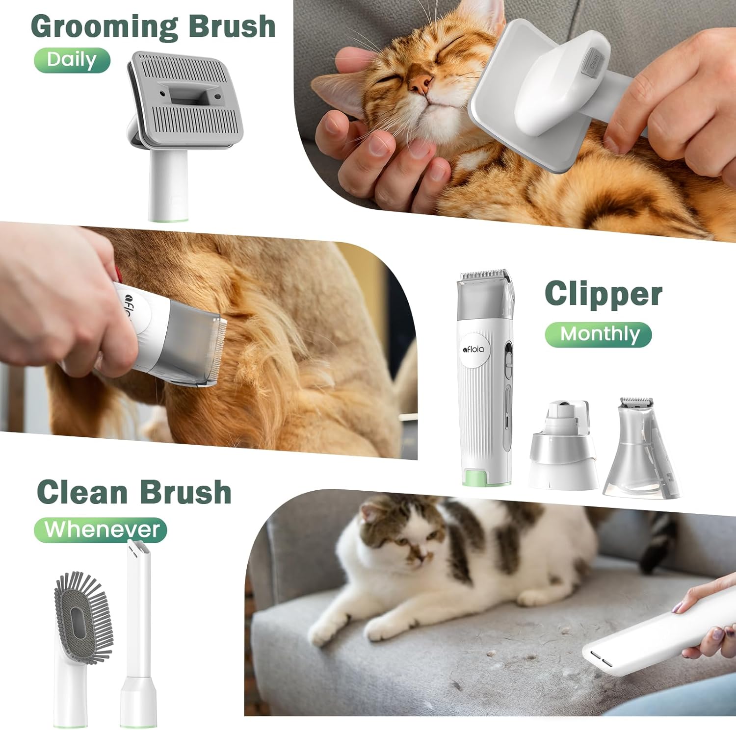 - đ¶ăProfessional Pet Salon at Homeă Afloia dog grooming kit includes 6 attachments: grooming & deshedding tool to remove loose and tangled hair; dog clippers, paw trimmer and nail grinder can fairly do hair cut job; cleaning brush and nozzle help clean the work area. This pet grooming kit saves time and expense in going to the pet store which will pay for itself quickly.