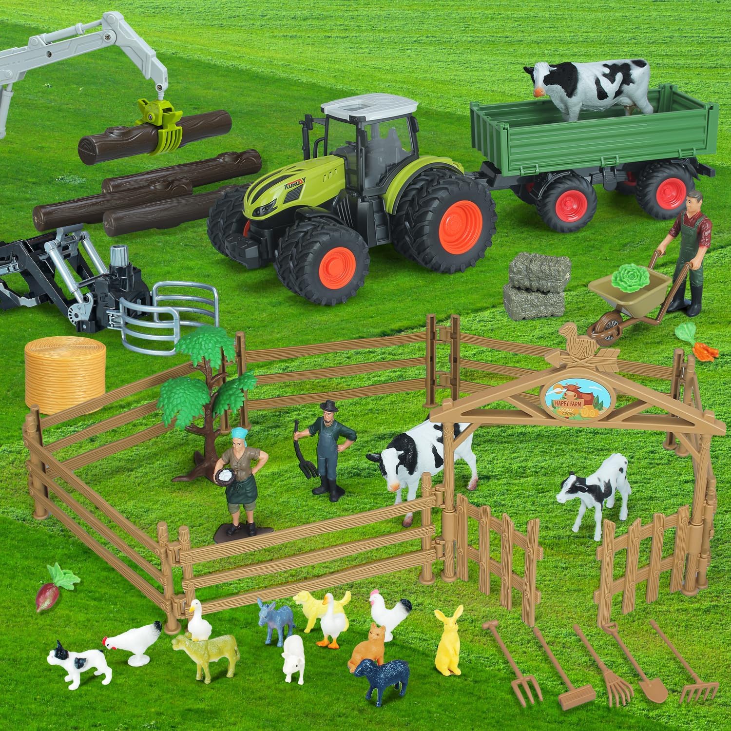 • 【46 Pcs Farm Toys Tractor】This tractor toys playset include 1 Friction Powered Tractor Vehicles, 1 Tractor Trailer, 1 Wooden Gripper, 1 Hay Bales Gripper, 7 Fence Set, 3 Farmer People Figures,1 Cart, 5 Farm Tools, 4 Log, 1 Round Bales, 2 bales of straw, 3 Vegetables, 1 Rock Pile, 1 Tree. And 2 cow and 12 livestock animals with realistic details and vivid colors. Kids would spend long hours exploring and building the farm animals world