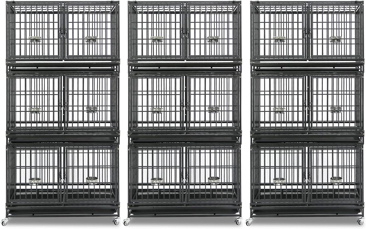 - Homey Pet Dog Crate Bank: Includes: 3 Pack Three tiers stackable dog crate(Size: 42.5"L x 28"W x 84"H). Each unit measure 42.5"L x 28"W x 30"H (the interior height: 22.5 inches). Each unit comes with1 x Tray, 2 x Metal Floor Grids, 4 x Locakable Casters, 1 x Safe Locks, 2 x Steel Feeding Bowls (Food & Water). Perfect dog crate cage kennel for medium small dog breeds. Choose spacious dog kennels keep your dog's comfort and safety