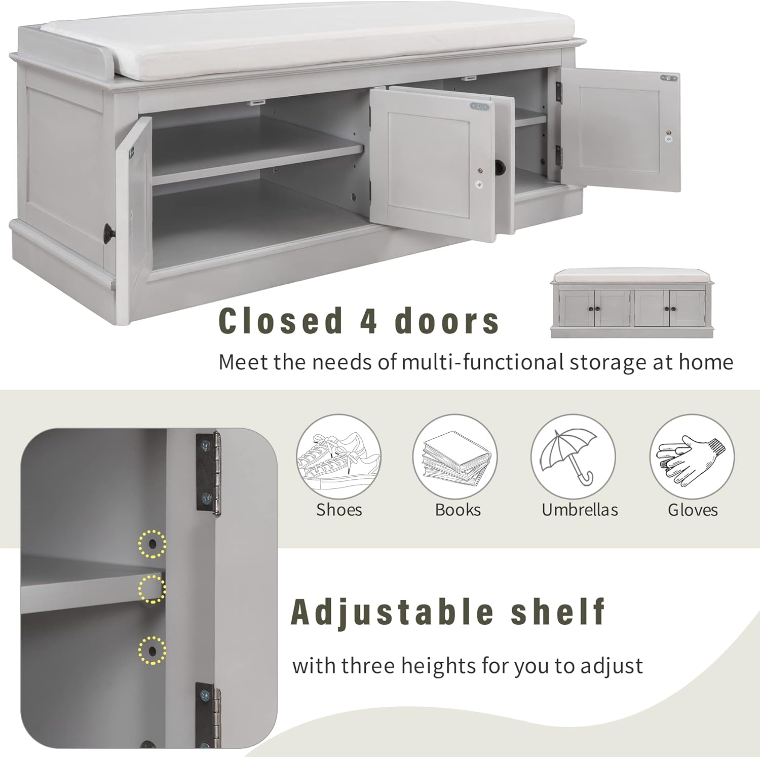 Storage Bench with 4 Doors and Adjustable Shelves, Shoe Bench with Removable Cushion for Living Room, Entryway 42.7" L x 16" W x 17.4" H (Gray Wash)