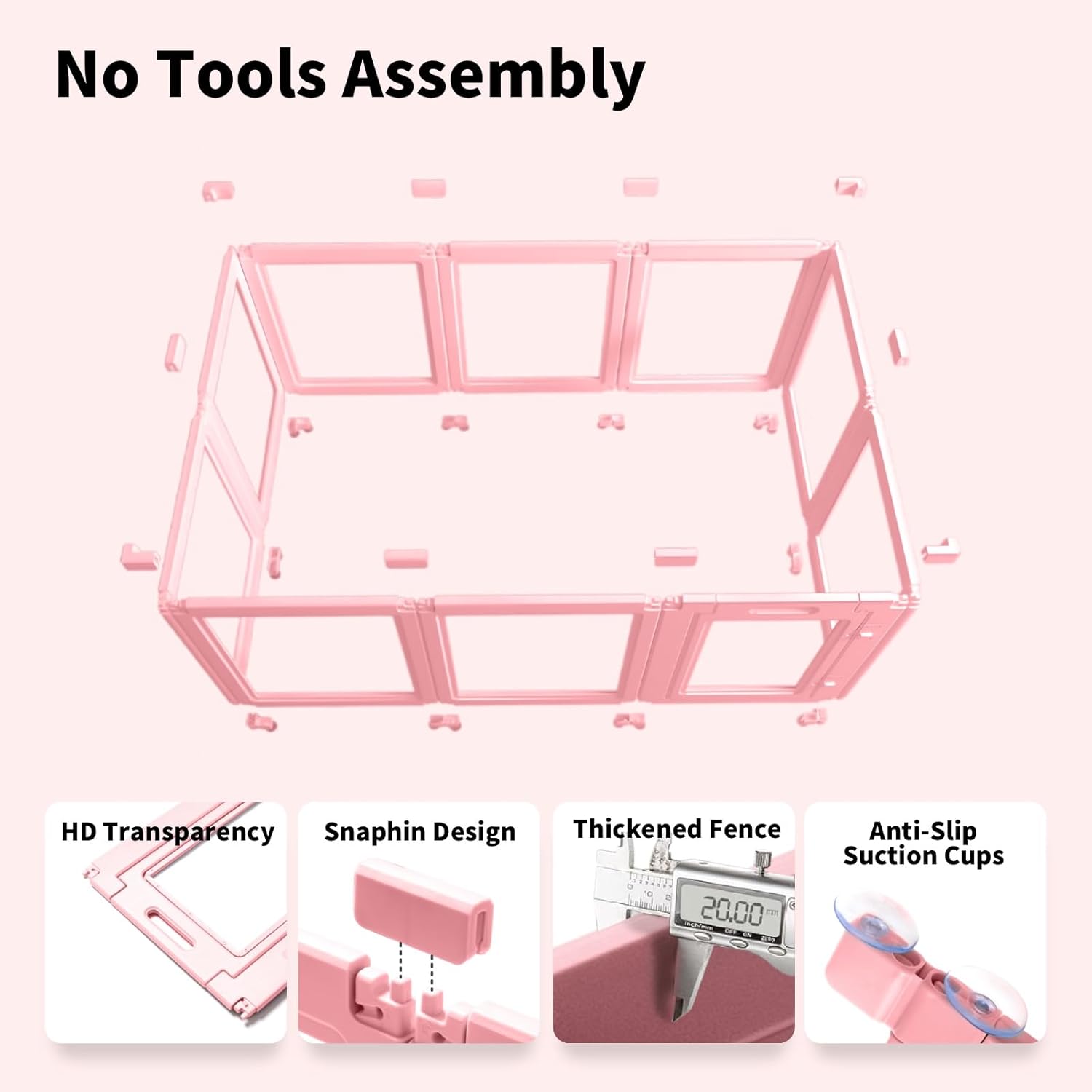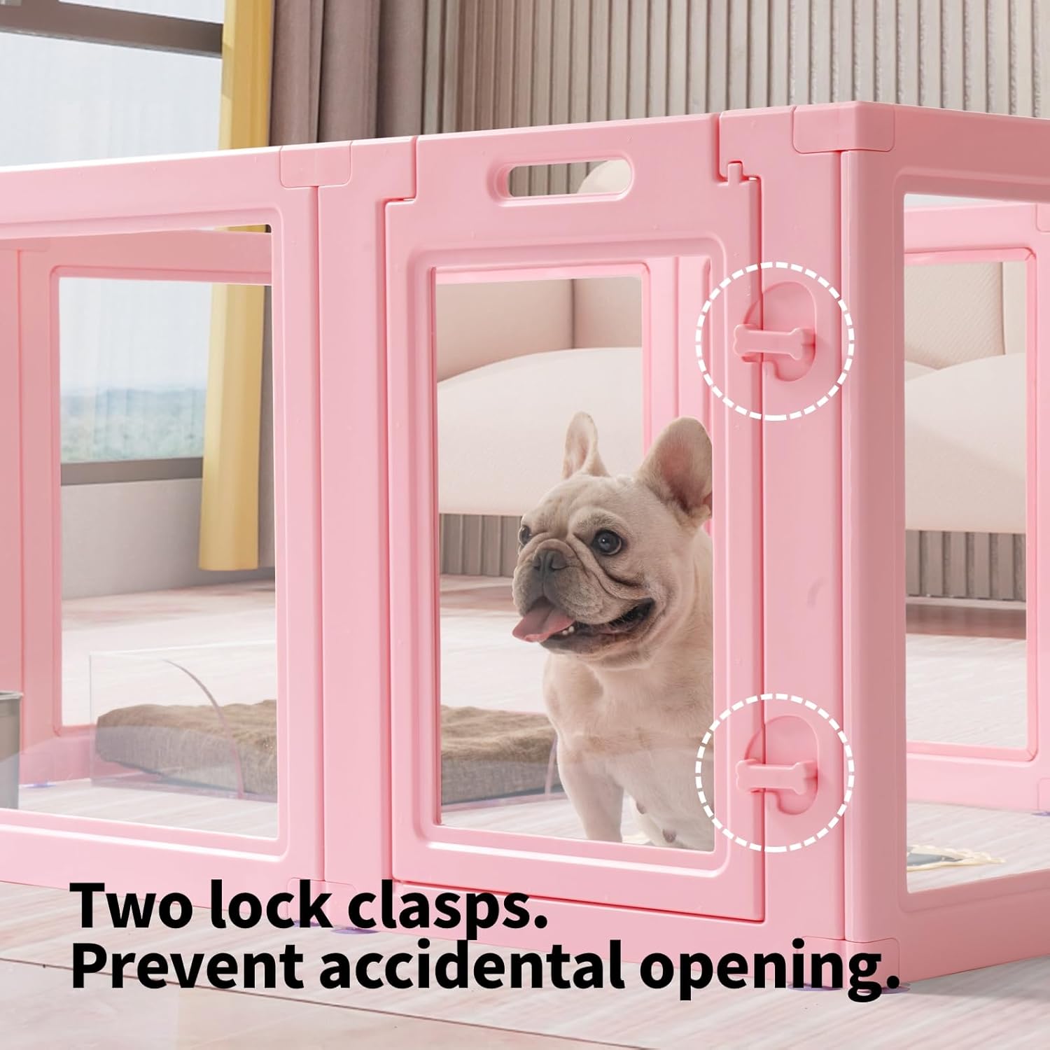 - STURDY & STABLE CONSTUCTURE:When assembling, two strong connect buckles are needed for every two panels of the dog playpen indoor, the bottom connecting piece with two suction cups, which can firmly suck on the floor whether it's wooden or floor tile, ensuring the stability of the dog pen and also protecting your floor from being scratched, pets are free to move and play in the pet playpen.