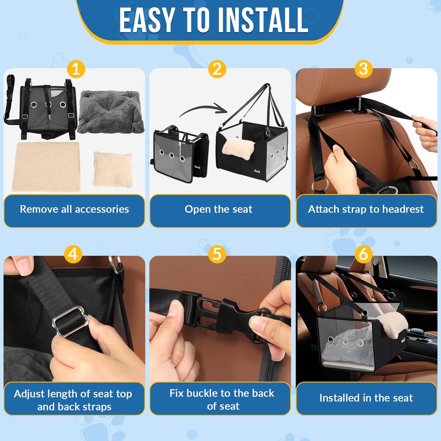 - Easy to Install --- Pet car seats are easy to install and disassemble, and can be folded flat for easy storage. There are built-in adjustable straps in the pet seat, allowing it to be quickly and safely installed in the front or back seat of a variety of vehicles. Note: The cotton pad and pillow wrinkles are caused by the compression of the transport package, and can be restored after opening the package and rubbing it for 48 hours.