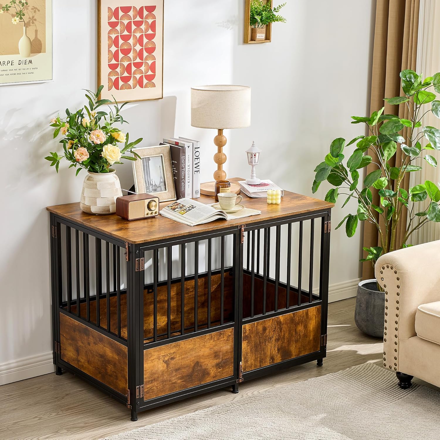 • 【Sturdy and Chew-Resistant】-- The design of thicked metal fence can effectively prevent dogs from chewing, increase firmness. Unlike other wire dog crate structures, easy to deform. Heavy-duty dog crate with double doors combines high-quality particleboard and metal, besides, add load-bearing metal tubes at the bottom, ensuring sturdiness and stability for long last use. The top provides additional storage space to place pet supplies and other decors. The maximum support weight of the top is 200 lbs