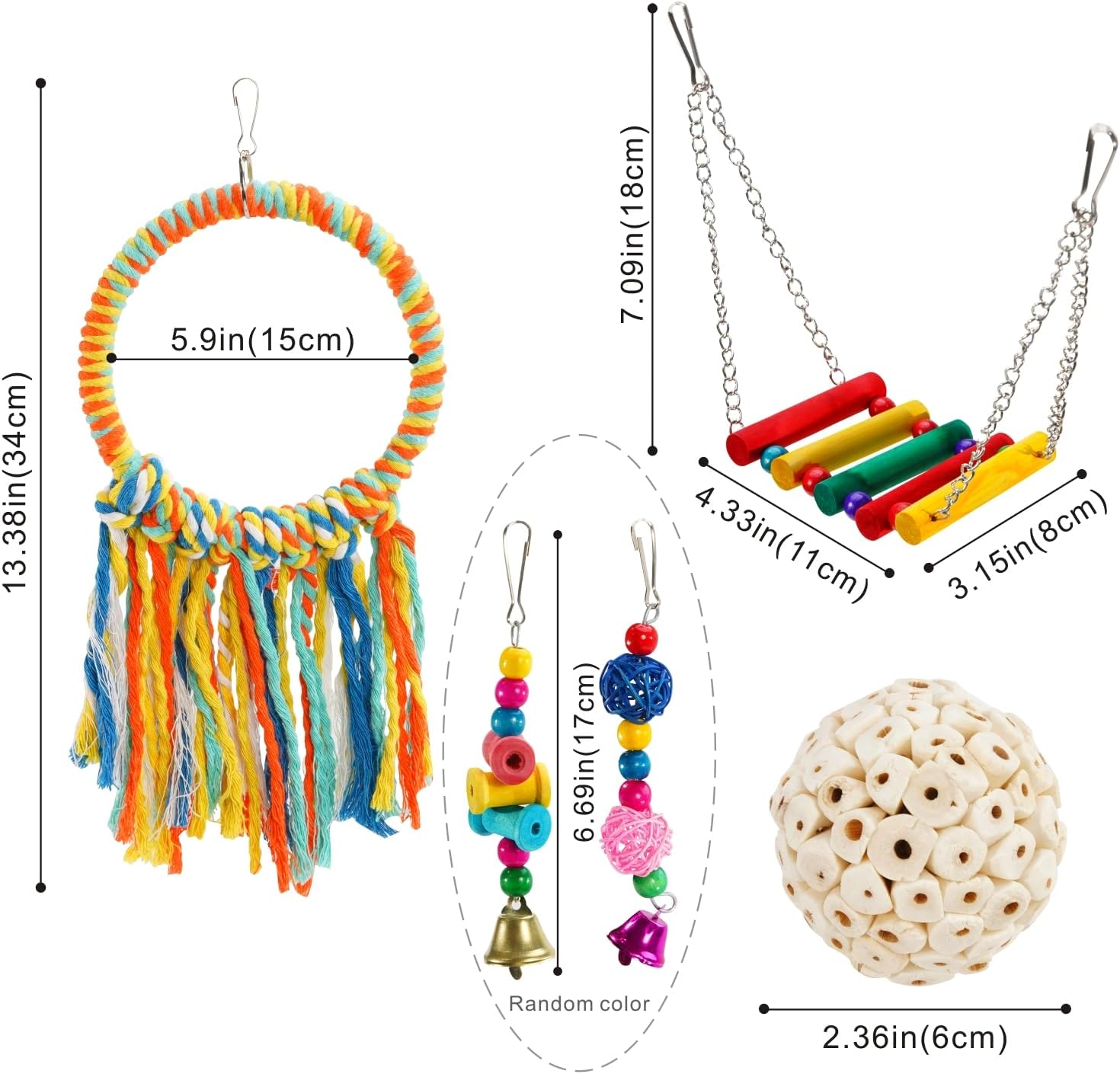- 【DESIGN】The toys for birds set includes 5 brightly colorful handmade chewing toys, that are 1 chewing toys, 1 hanging bells toys, 2bird swing toys, 1 rattan balls.These fun bird cage toys will attract the interest of your pet birds.The loop bird swinging rope of the long tailed parrot has been optimized to the product on the first page, but the detailed pictures have not been updated in a timely manner.