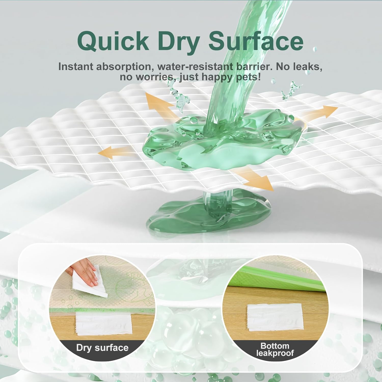 • 【Rapid Absorption】Grid design for diversion function, which help to expand the absorption area, ensuring faster urine penetration. With an impressive 1000ml capacity and ultra-fast absorption rate, our pee pads excel in maintaining dryness, keeping your pet comfortable and free from wetness on its belly, legs, or paws.