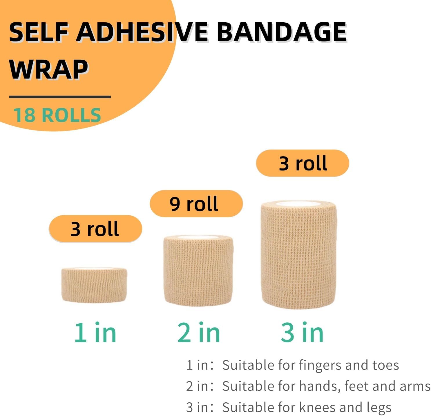 - PACKAGE INCLUDE】Comes with 18 roll of cohesive wrap bandages. Sufficient quantity for you to use.We offer 3 sizes in this package to meet the needs of different body parts and make it more convenient for you to use.Due to the presence of latex in the adhesive of Cohesive Bandages, individuals with latex allergies should not use it.