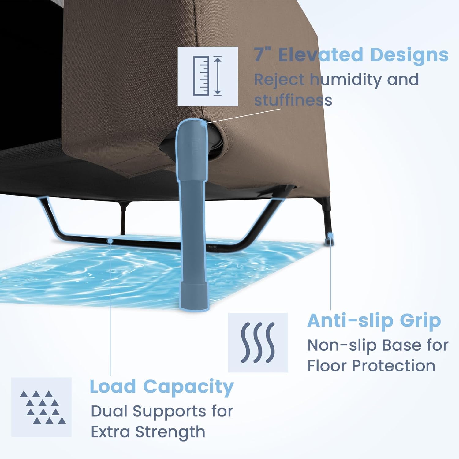 - Versatile 2-in-1 Dog House: Assembly is a breeze with no tools or screws needed – your pet will be lounging in luxury within minutes. When needed, effortlessly transform this weatherproof structure into a 2X1 Textilene elevated dog bed for easy maintenance and unparalleled comfort.