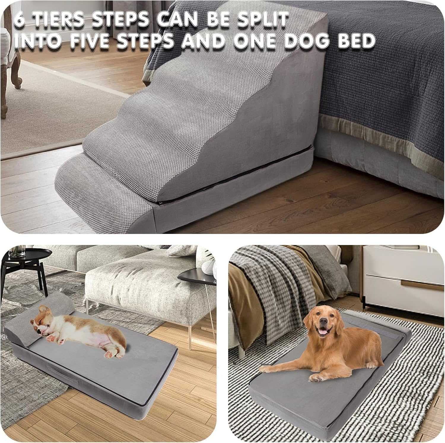 - Very Important Note: Our dog stairs is 6-tier stairs, which can be divided into 5 staris and one steps with a dog bed. You have received a 6- tier pet stairs, so don't misunderstand it. It is not have 3 items