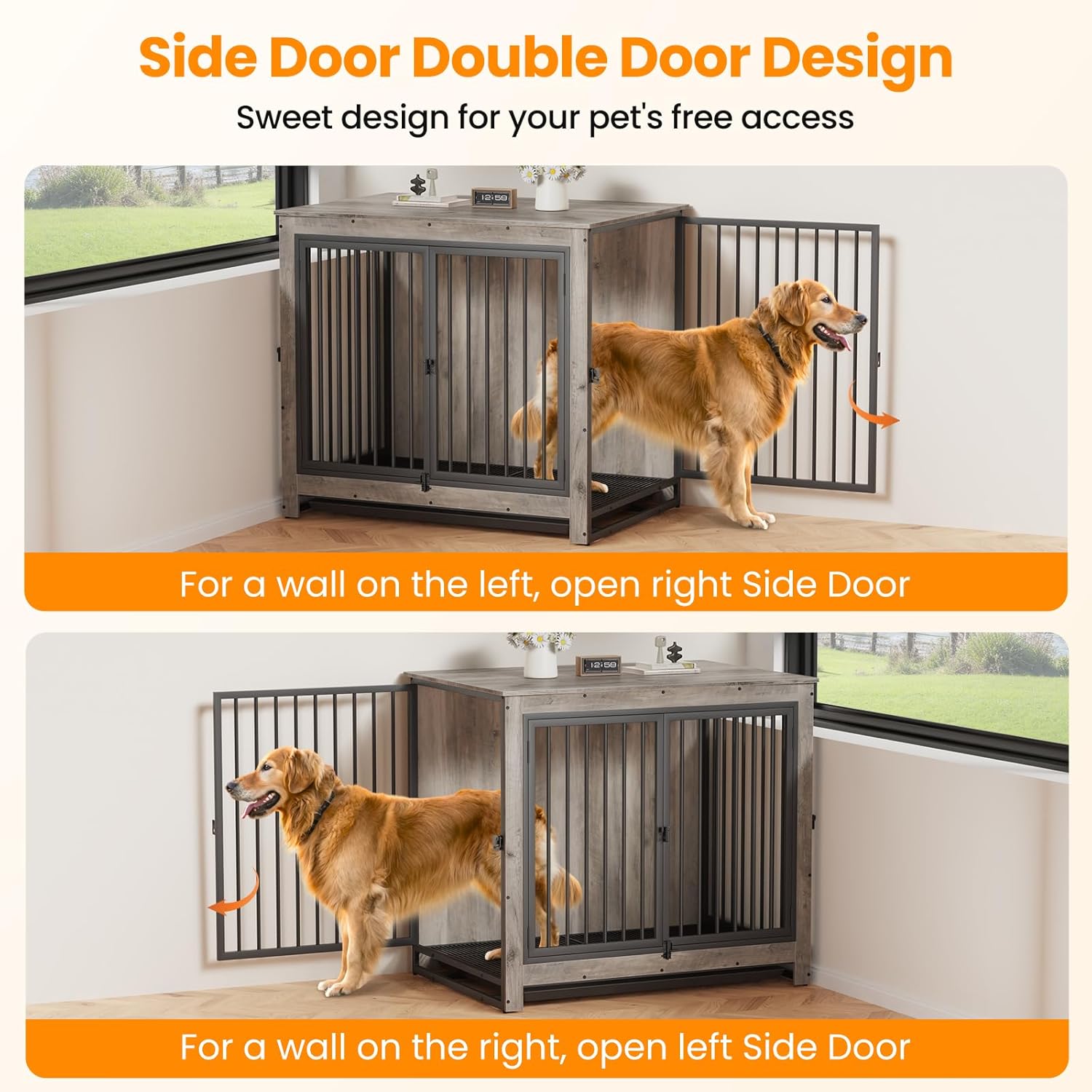 - đ¶ăDouble Side Door DesignăThis furniture-style dog kennel indoor has front and two side openings for access, both the left side door and the right side door can be opened to fit various spaces, definitely an ideal crate for your home