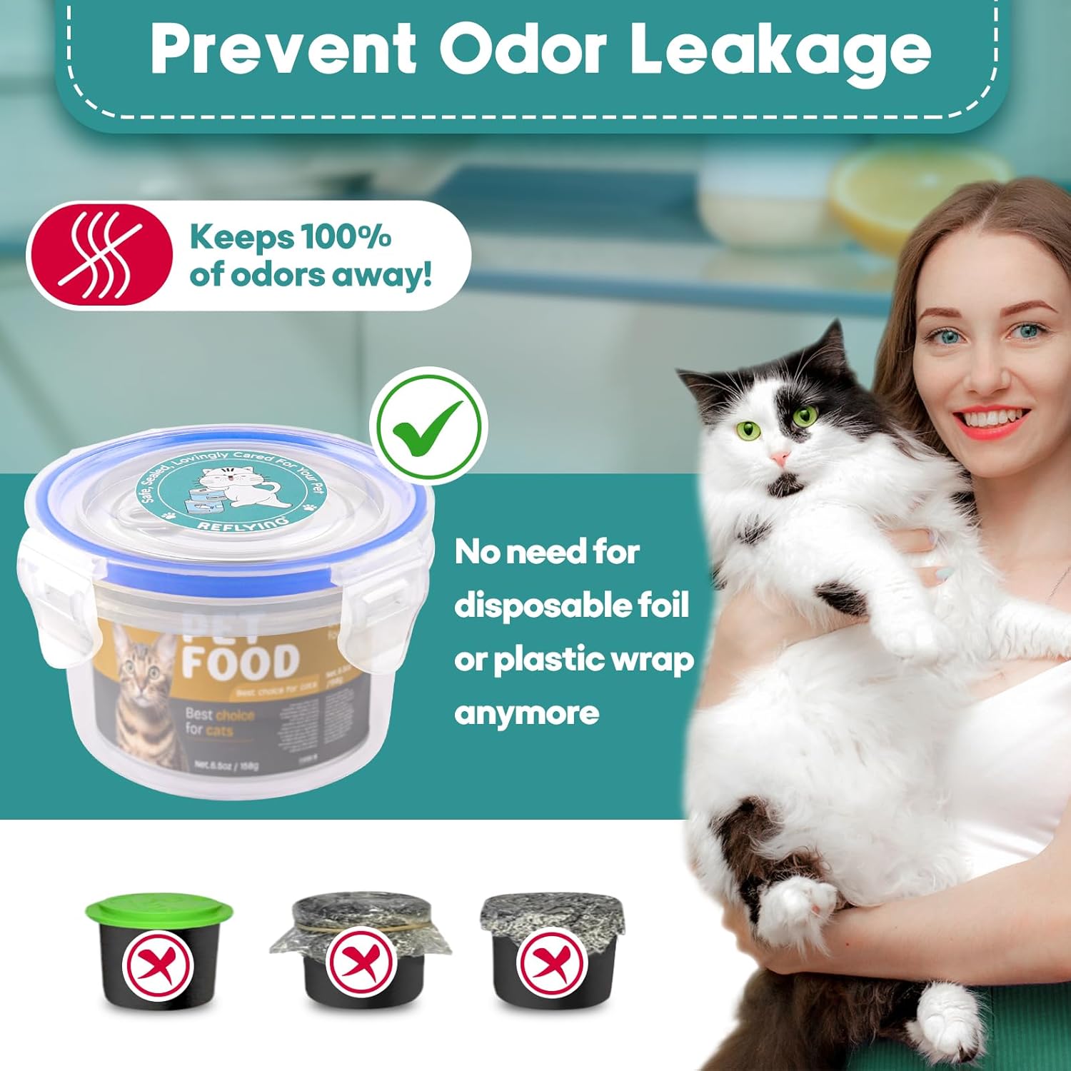 • SAY GOODBYE TO USING PLASTIC WRAP: No more plastic lids, aluminum foil and plastic wrap for canning lids. These clear canned cat food containers allow direct access to the food, isolate odors, are easy to use, and keeps the freshness of your pet's canned food