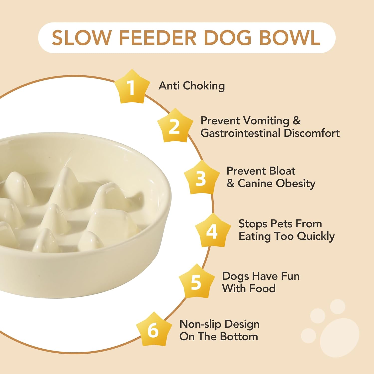 Ceramic 7.3 inch Dog Bowl Slow Feeder, Slow Pet Food Dish for Medium and Small Dog, Stop Bloat, Preventing Choking(Single Bowl, Beige)