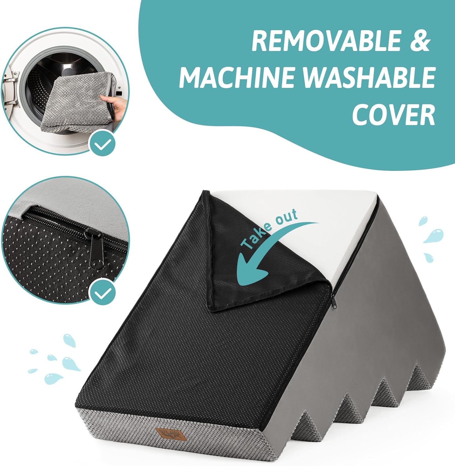 - Non-Slip Base and Removable Cover: Our dog steps for beds are equipped with a non-slip base featuring rubber dots for additional grip, minimizing movement during use. The pet steps cover is waterproof on the inner side, so you donโt have to worry about stains seeping into the foam. The outer cover is removable and machine washable for easy cleaning