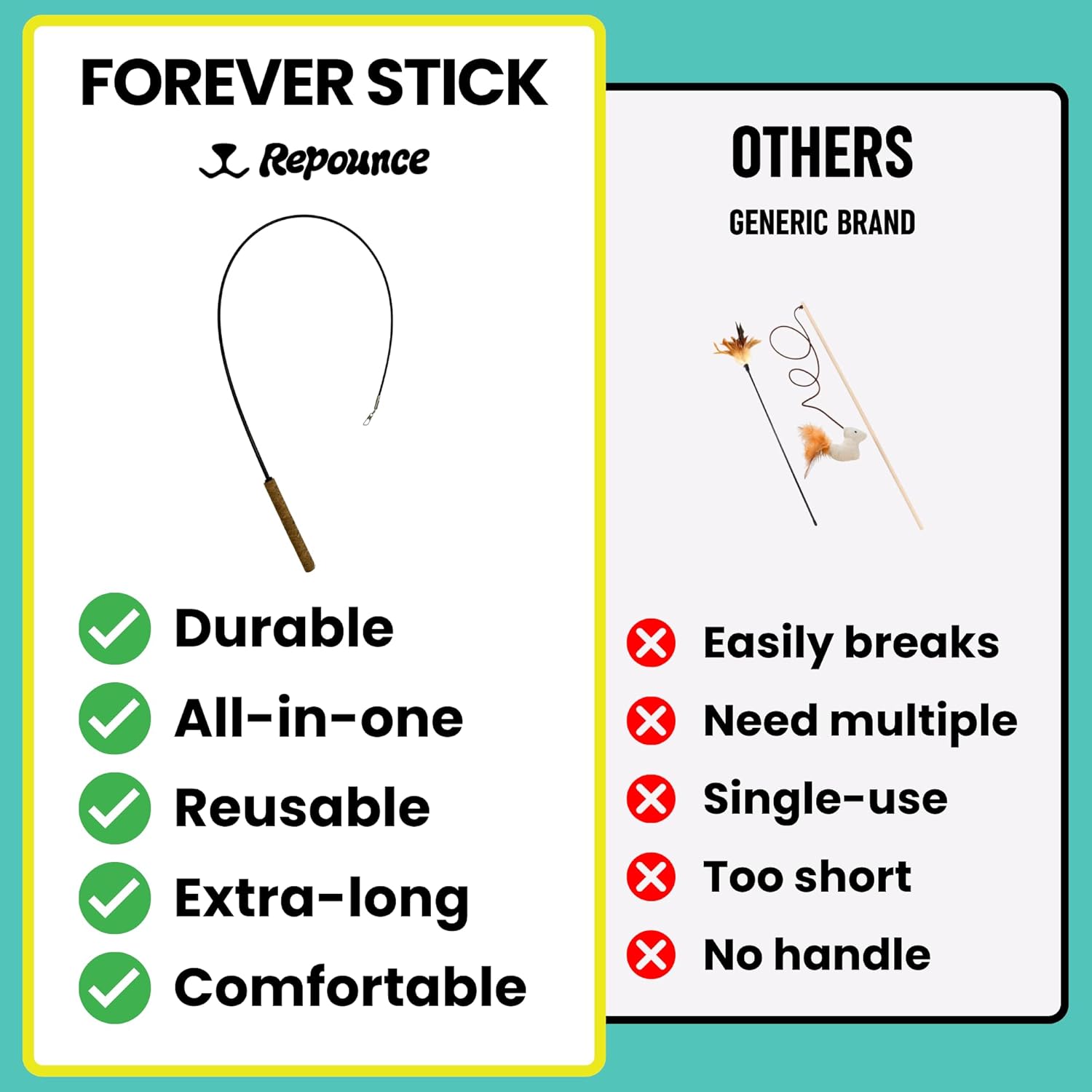 - Forever, No More Single-Use Products: Stop buying flimsy cat wand toys that snap in days. The Forever Stick is built to last. Just swap out the toy, not the wand! This cat toy wand is reusable and perfect for cat owners who want durability and value. Great for cat toys for bored indoor adult cats and the best cat accessories for indoor cats.