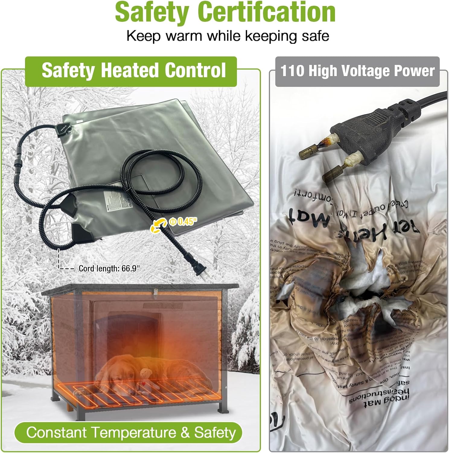 • Safe Heating System: : UL tested heating pad with automatic heated control, temperature from 89 to 116°F. Build in high-temperature protection device preventing overheating or chilling. 6.5 ft chew-resistant cord adds an extra layer of safety