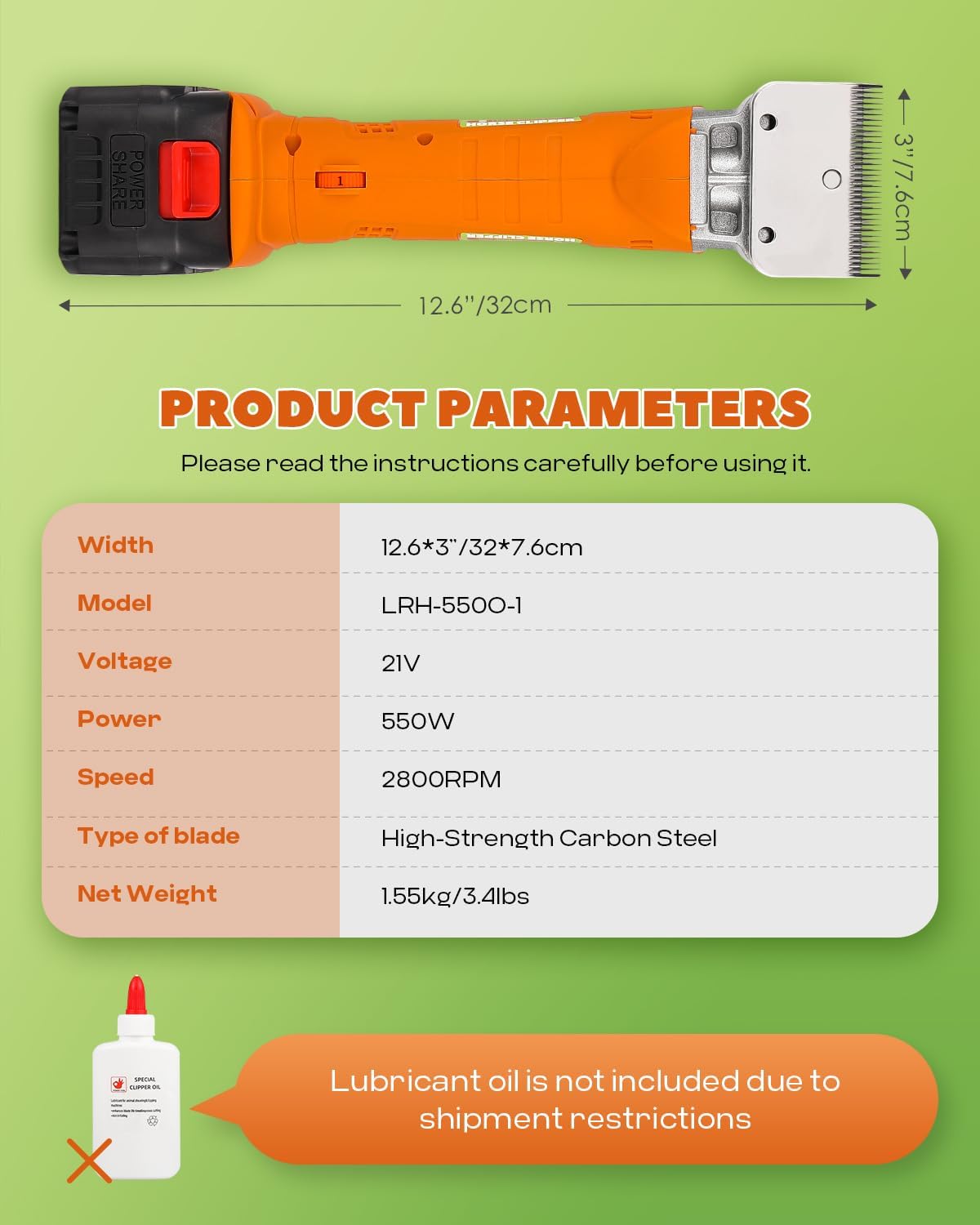 - [PACKING LIST]: 1 x Electric horse clipper ; 2 x 4000mAh lithium batteries; 1 x Charger; 1 x Cleaning brush; 1 x Oil bottle (WITHOUT oil); 1 x Blade tool driver; 1 x Durable carriage case; 1 x Operating manual. PLEASE Note: Lubricant oil is not included due to shipment restrictions; please buy SEWING MACHINE OIL separately. This oil effectively extends the clipper's lifespan.