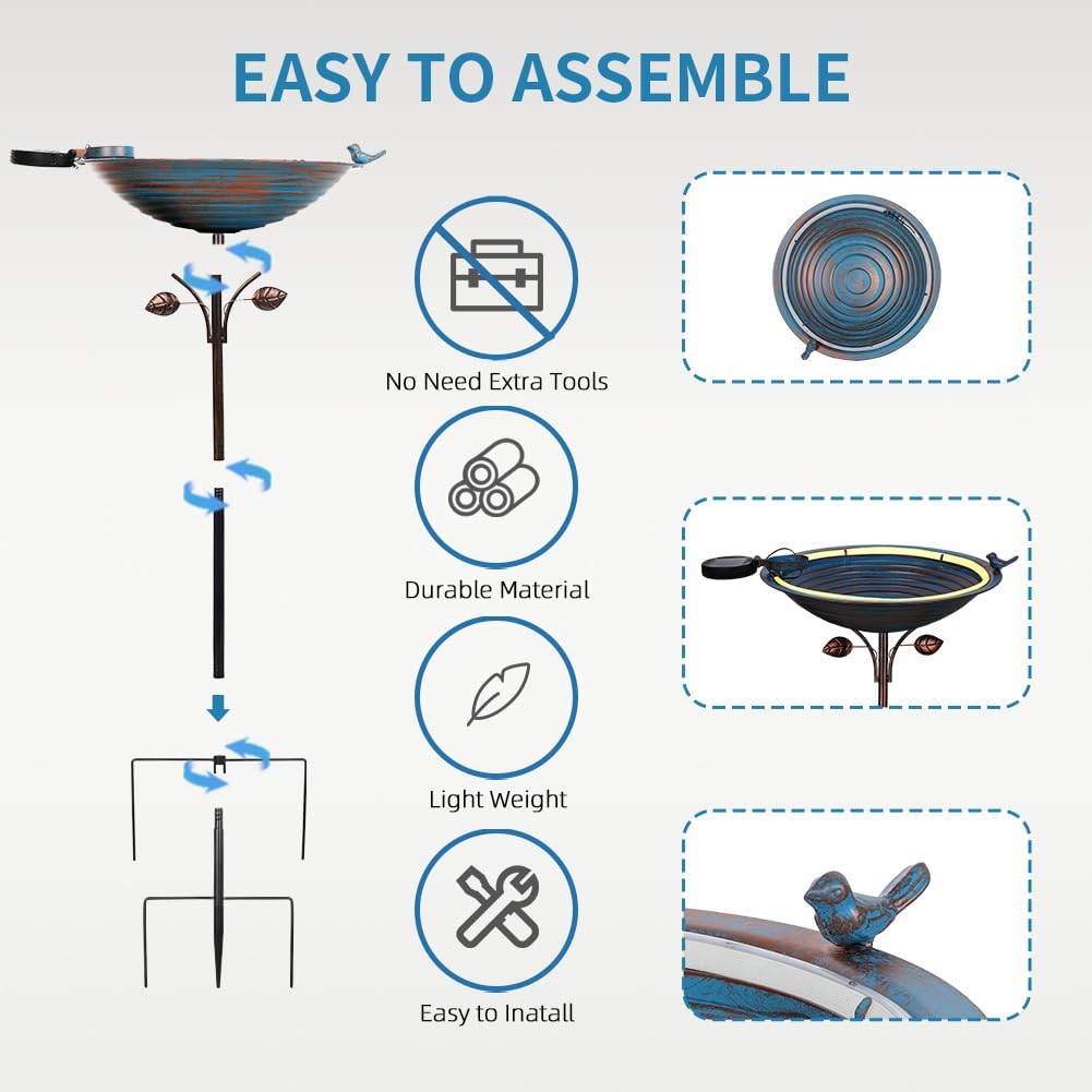 • Durable and Sturdy: The outdoor bird bath is made of premium metal and coated with multi-layer powder, rust-proof, wind-proof and rain-proof. Upgraded 5 prongs make this standing birdbath stay in the soil of your garden firmly