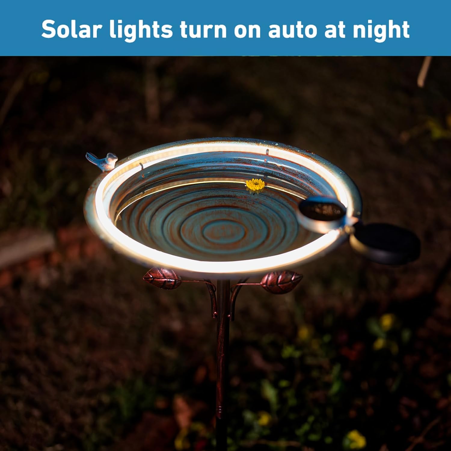 • Bird Bath with Solar Light: This metal bird bath measures 39 inches high x 15 inches diameter. Designed with a circle of light strip around the edge of the birdbath bowl, it will automatically absorb sunlight during the day and light up at night, great for decorating the garden