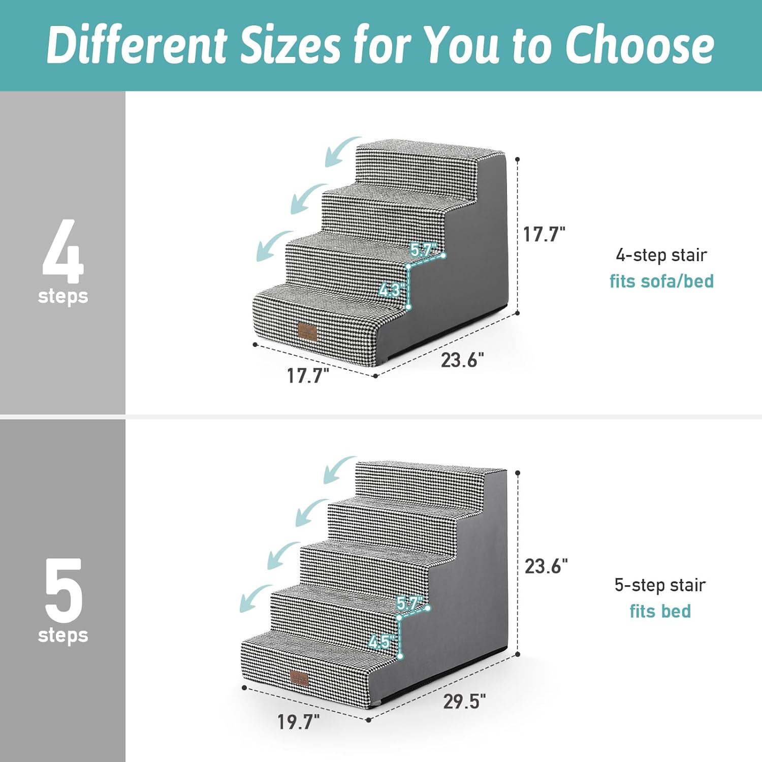 - Multiple Options: The dog stairs for small dogs are available in 4-step or 5-step, with various color choices to suit your needs. The 4-step stairs are ideal for sofas and low beds, while the 5-step dog ramp is better suited for high beds and car trunks