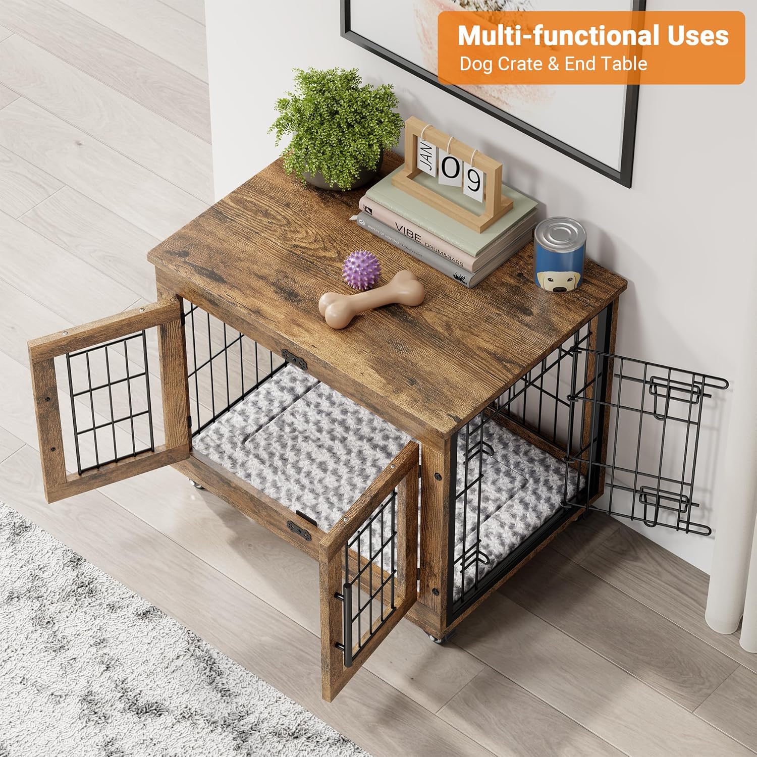 Lulive Small Dog Crate Furniture Set of 2, Dog Kennel Indoor Double Doors Wooden Dog Cage, 27' Heavy Duty Dog Crate with Cushion & Wheels, End Table Pet House Chew-Resistant Up to 30 lb, Rustic Brown