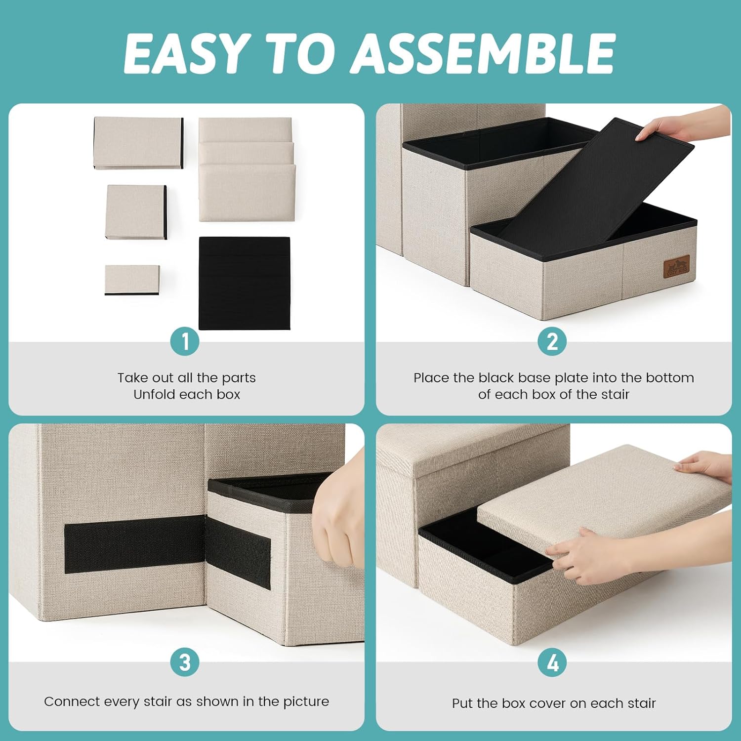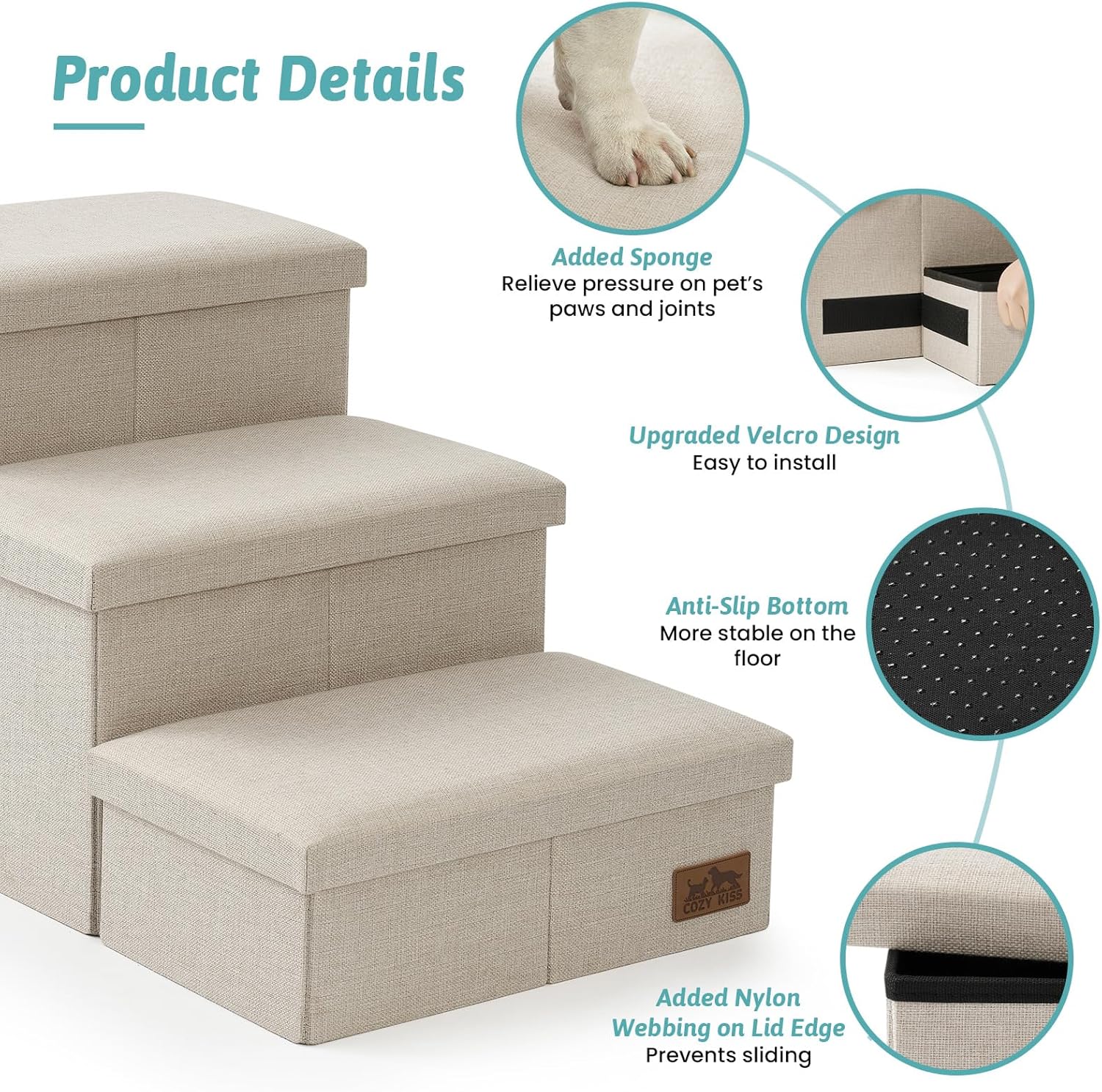 - Multi-Functional Design: COZY KISS dog stairs not only provide a safe and easy way for pets to climb onto furniture but also feature storage boxes. Each level is a separate storage compartment, offering a practical solution for organizing pet accessories like clothes, toys, and blankets.