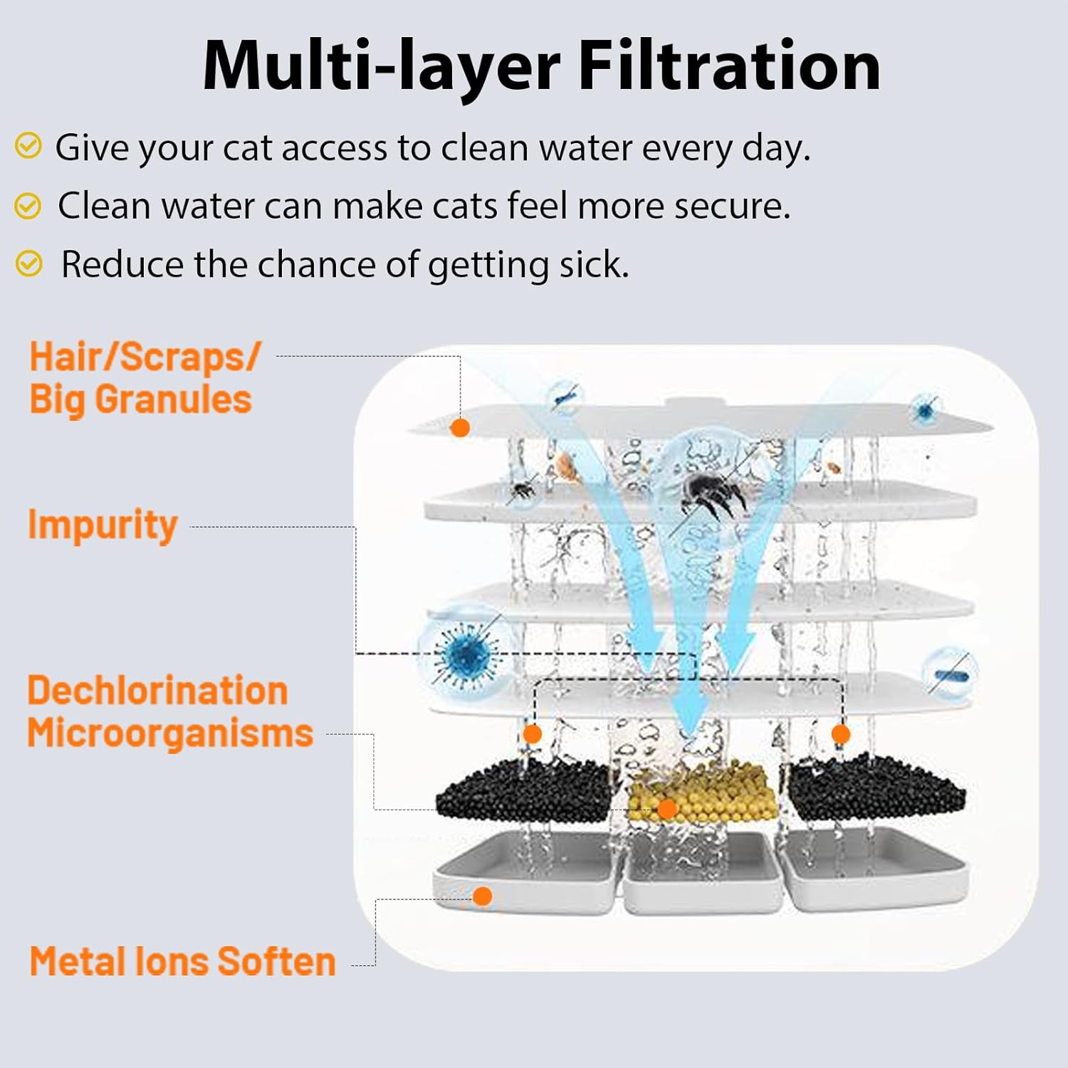 - Multiple Filtration: Every drop of water is filtered through a vertical filtration system to remove all impurities and provide oxygen-rich and better-tasting water. In our catit water fountain, the activated carbon removes odors and bad tastes, while the filter mesh captures hair and larger debris. The pump's high-density porous filter cotton eliminates fine particles, ion exchange resin softens tap water, and medical stones remove heavy metals while releasing beneficial trace elements.