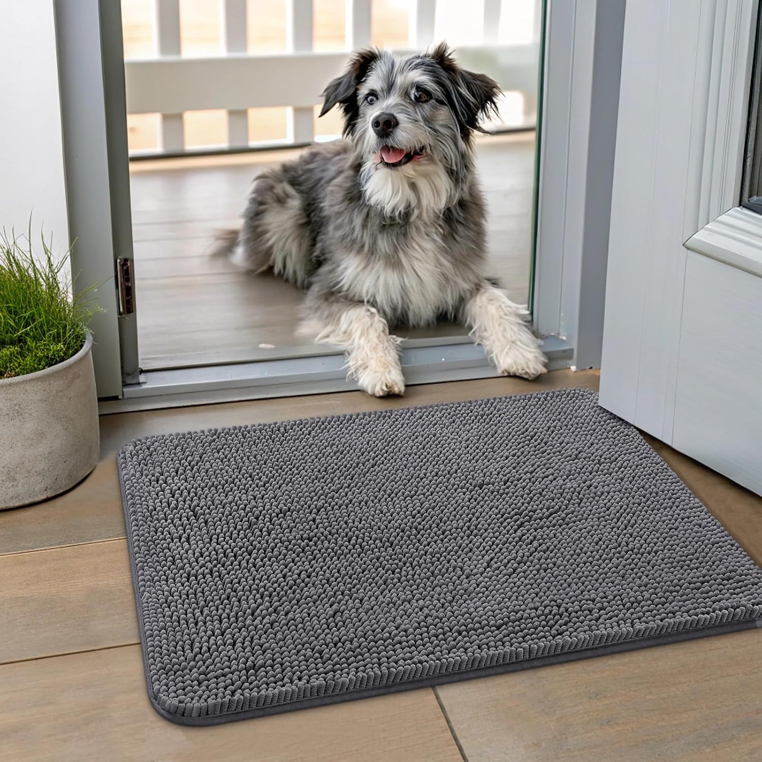 - [Absorbent and Dirt Trapper] High-density chenille dog mat, super absorbent and dirt-catching, whether wet after shower, muddy or moisture bring back by dogs, it can absorb well, so that you and your favorite pet can say goodbye to the wet and mud. It's an excellent choice for use as an entryway door mat, a welcome door mat or a dirt-trapping door mat.