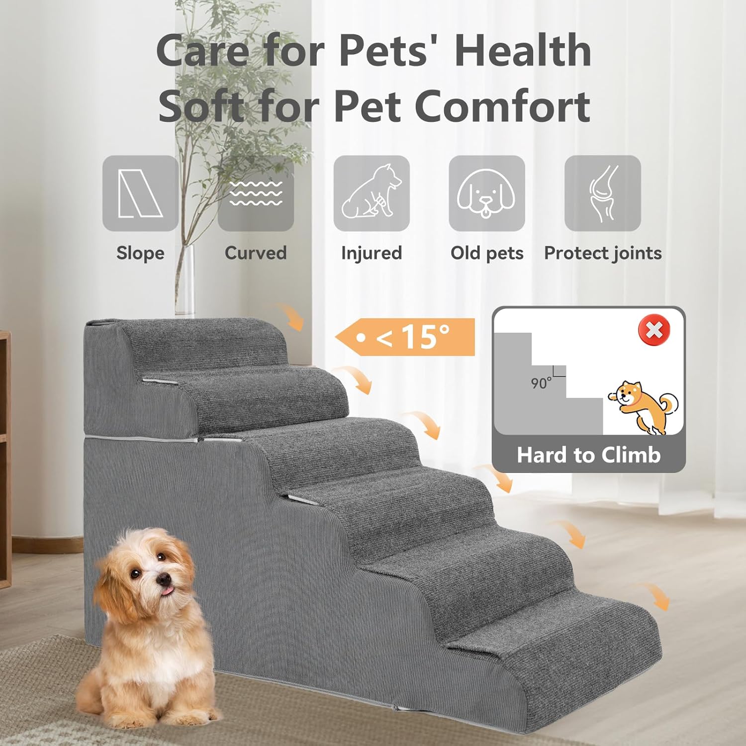 • Customizable Height for Every Adventure: Our dog stairs with 6-step and 7-step designs ,which is uniquely crafted to adapt to your pet's needs. The modular design allows for easy assemblyβ€”simply zip or unzip the sides to create a 4+2 or 4+3 configuration. Whether your pet needs a gentle incline or a higher climb, these stairs grow with them, offering comfort and confidence every step of the way