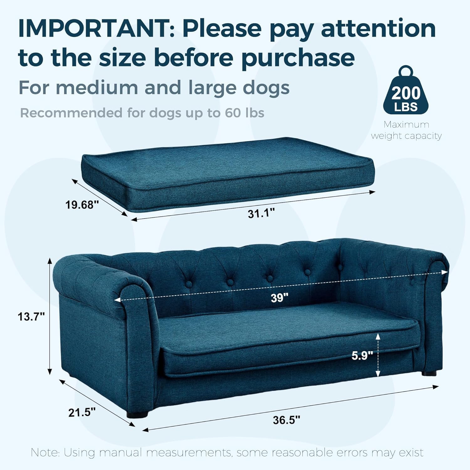• Warm tips: The size of the large dog couch is 38.9" x 23.2" x 13.7". Cushion size: 19.68" D * 31.1" W. Maximum weight capacity is 200 lbs. Suitable for medium and large dogs, not suitable for extra large dogs. Please pay attention to the size of the product before shopping.