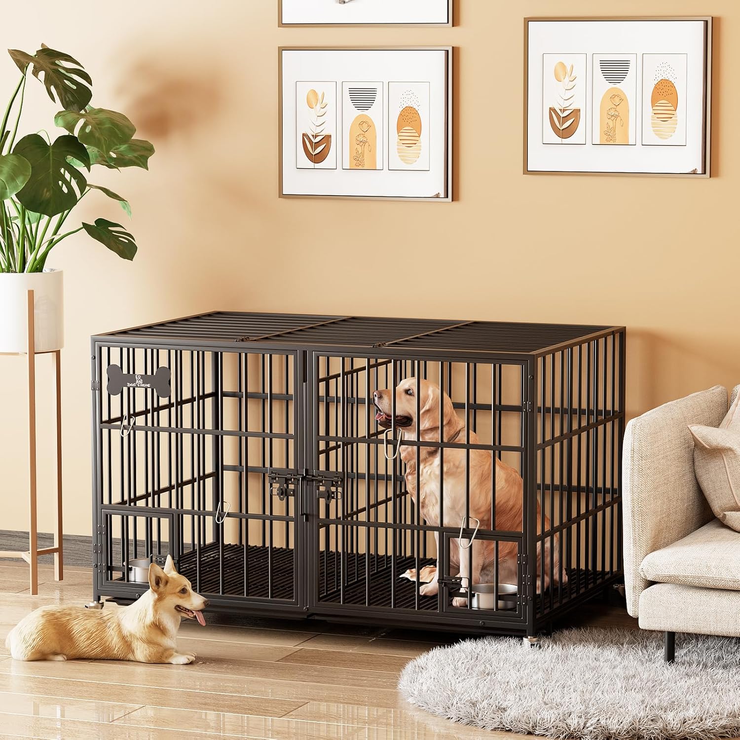 - 【Practical & Easy to Move and Clean】The dog crate comes with four smooth rolling locking wheels for easy movement and fixation, you can easily move the crate to different positions as needed. The dog crate comes with two pull-out tray for easy removal and cleaning. It also comes with a safety latch to avoid your smart dog from opening the iron door, effectively protect your pet.