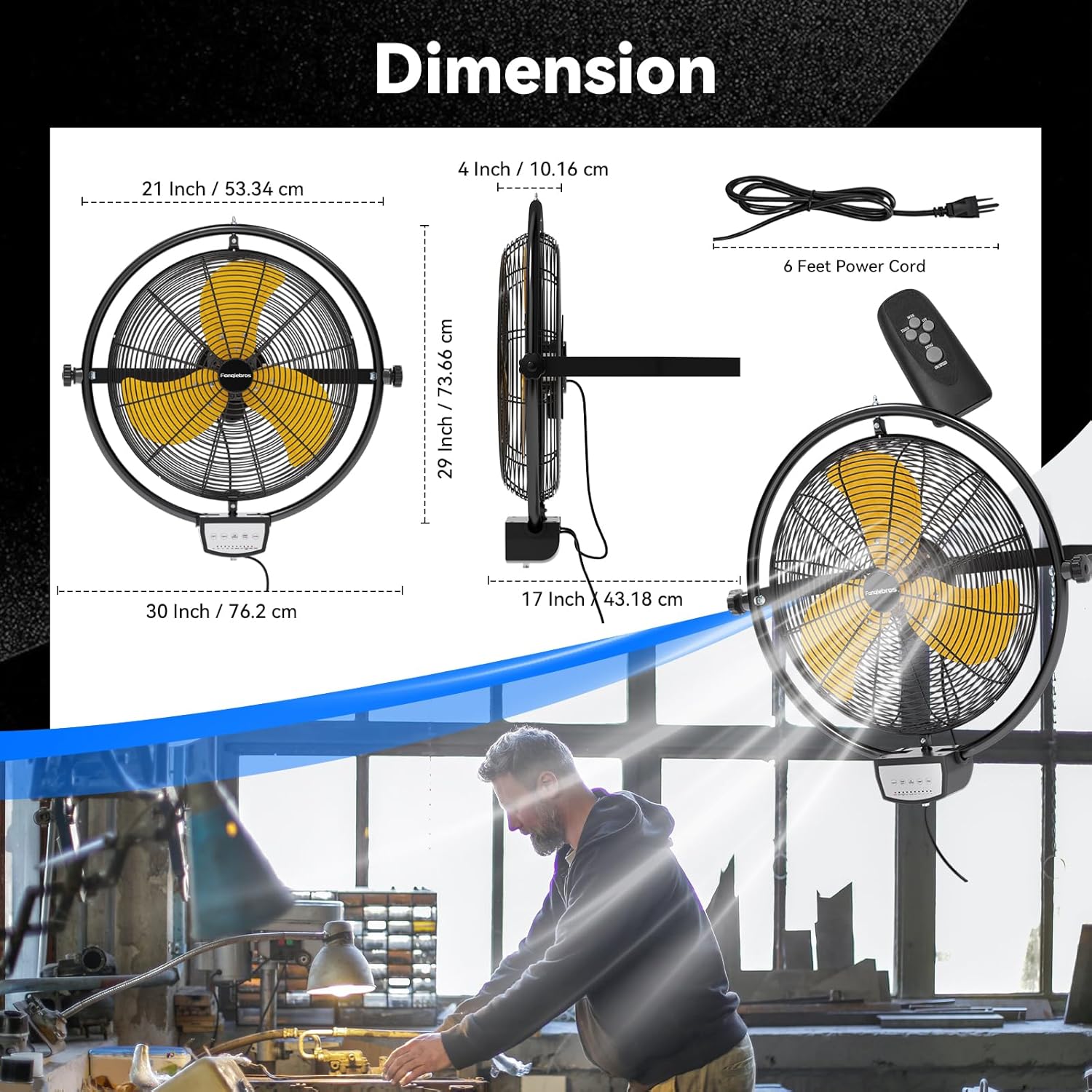 • ๐‡๐ข๐ ๐ก ๐•๐ž๐ฅ๐จ๐œ๐ข๐ญ๐ฒ ๐€๐ข๐ซ ๐…๐ฅ๐จ๐ฐ - The heavy duty wall fan design makes the operation more intuitive and simple, and the high, medium and low speeds can be adjusted by the remote control to meet different needs. High speed 5500 CFM, medium speed 4000 CFM, low speed 3800 CFM, providing hurricane-like airflow to meet your garages, shops or outdoor use๏ผˆNote: used on a covered patios or porch, BUT NOT EXPOSED TO RAIN๏ผ‰