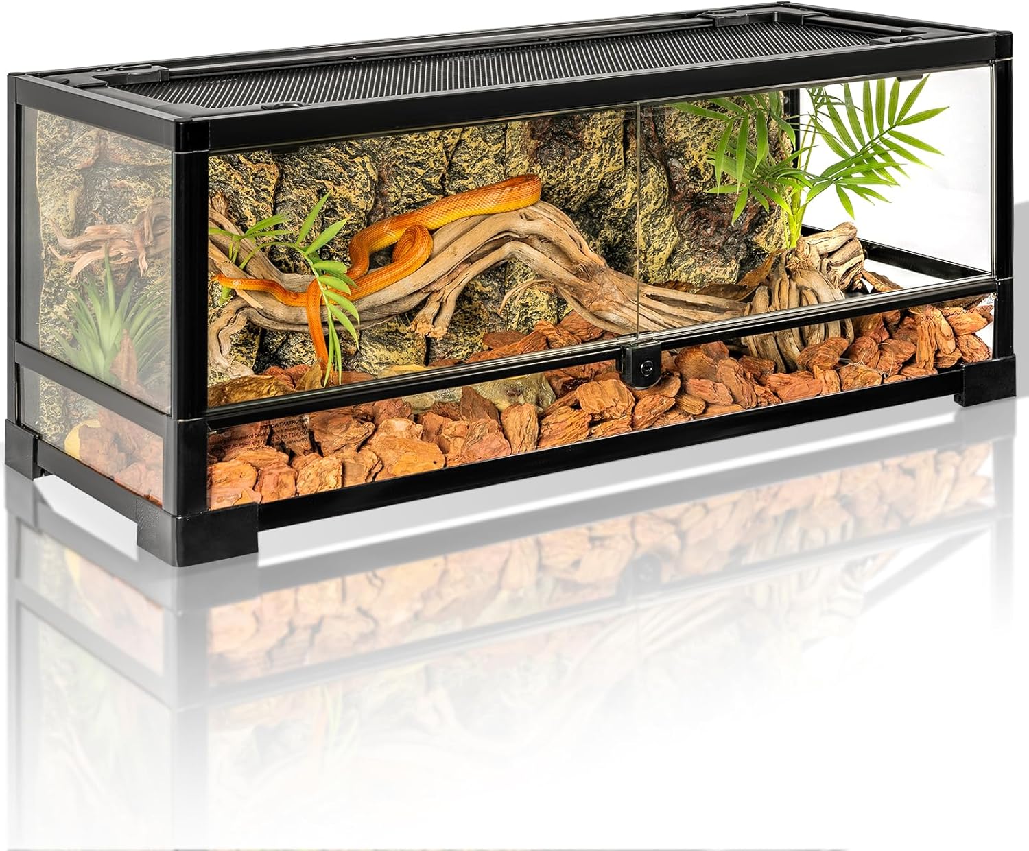 - Premium & Durable Construction: Featuring tempered glass on all four sides and aluminum alloy frame, iron mesh top, this terrarium delivers exceptional durability. Provides crystal-clear, uninterrupted viewing from every angle – an essential component for reptile habitat
