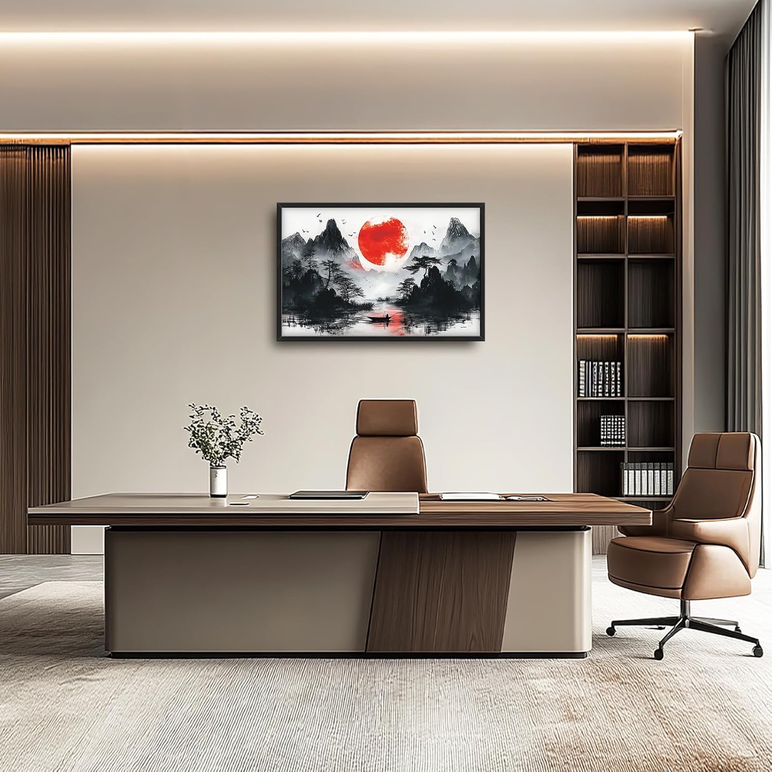 Framed Large Japanese Mountain Wall Art for Living Room, Oversized Asian Red Sun Lake Landscape Wall Decor Nature Canvas Painting Home Decoration for Living Room Bedroom Office 36"x24"