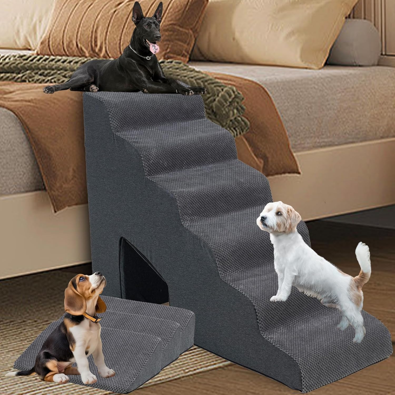 • [30inches" Height Bed Stair for Dogs and Cats]:The height of our steps is the highest on the market currently ,the size of the pet foam ramp is 41.5x15.7 x 30in, this pet step for small dogs helps access beds or couches of up to high bed ,high density memory foam makes it ideal for the small to medium breeds, and the silicone paw print on the bottom makes it more stable so the puppy can climb up and down without falling. We recommend the pet ladder for pets under 60 pounds.