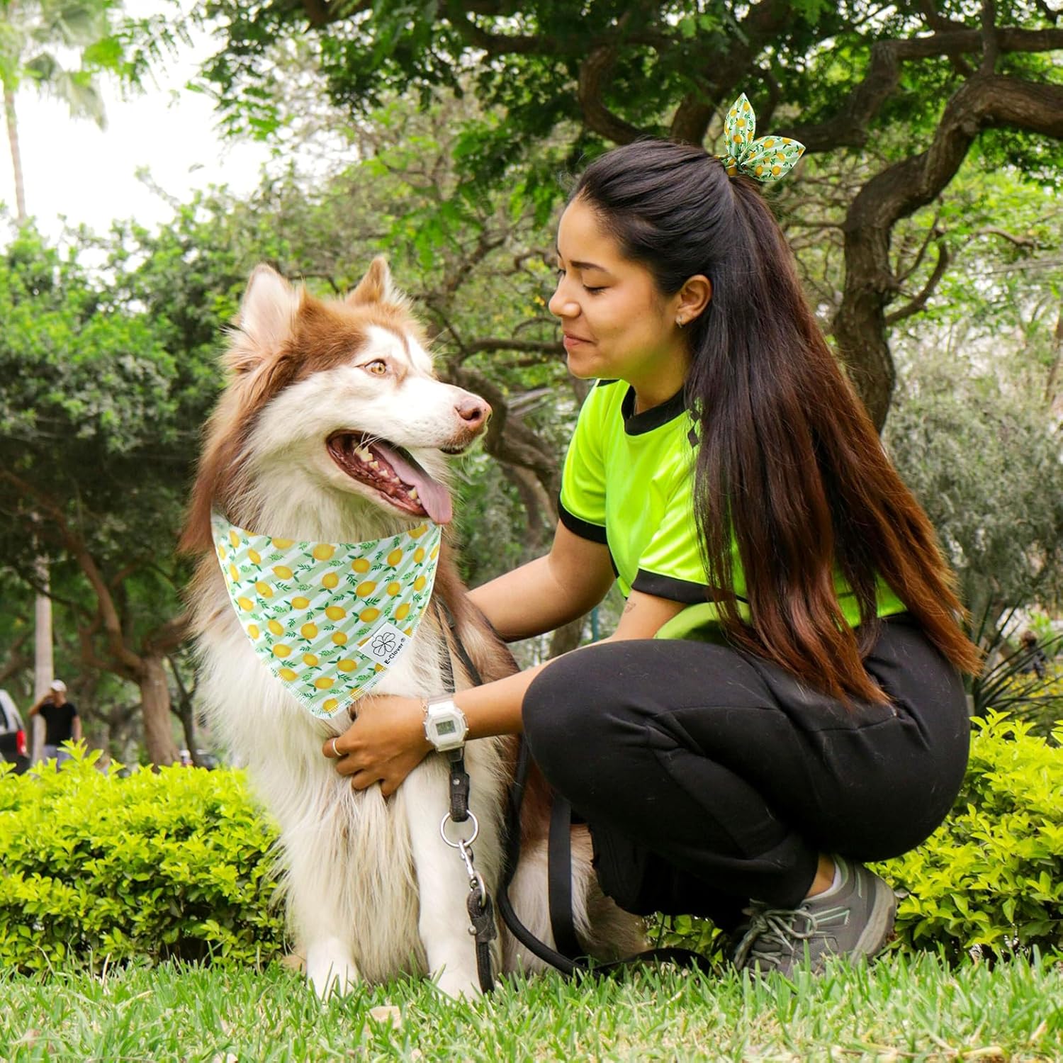 E-Clover Summer Lemon Dog Bandanas & Matching Scrunchie Set Green Stripe Dog Scarf Bibs Pet Bandana with Bow Tie for Small Dogs Puppy Owner Mom