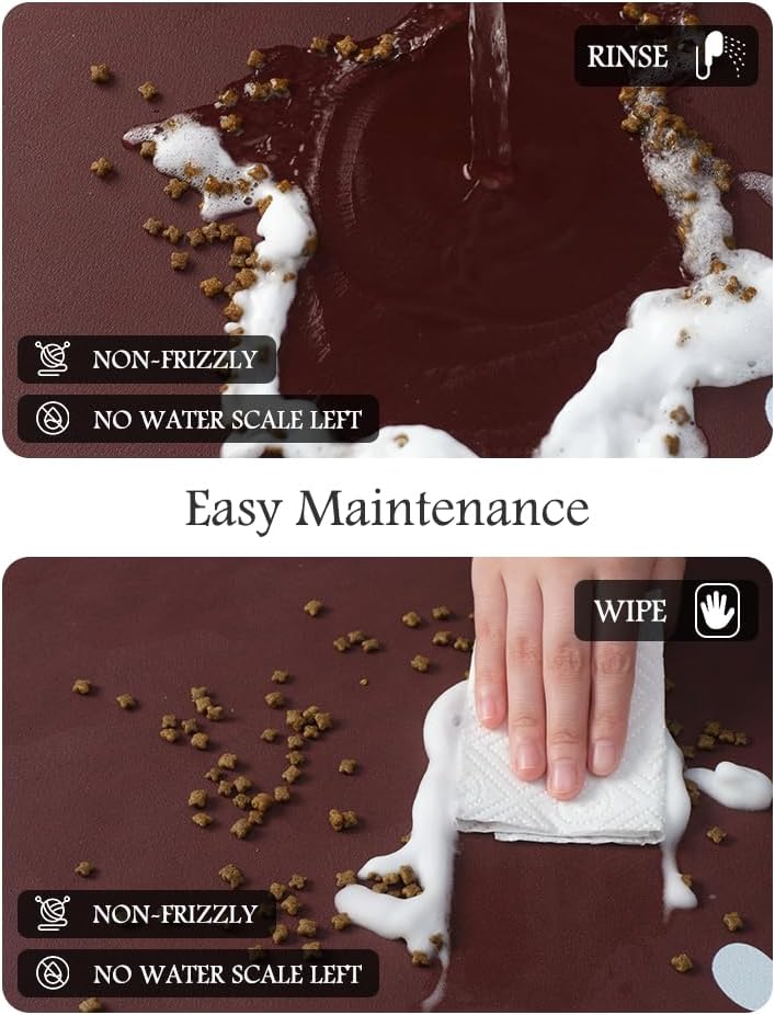 • Keep Clean & No Stains:No marks will be left when food and water are dropped on the dog food mat. Unlike traditional silicone pet feeding mats, our pet feeding mat for food and water won't pick up pet hair or dust, and won't build up tough-to-clean limescale, keeping the dog bowl mat as good as new forever.