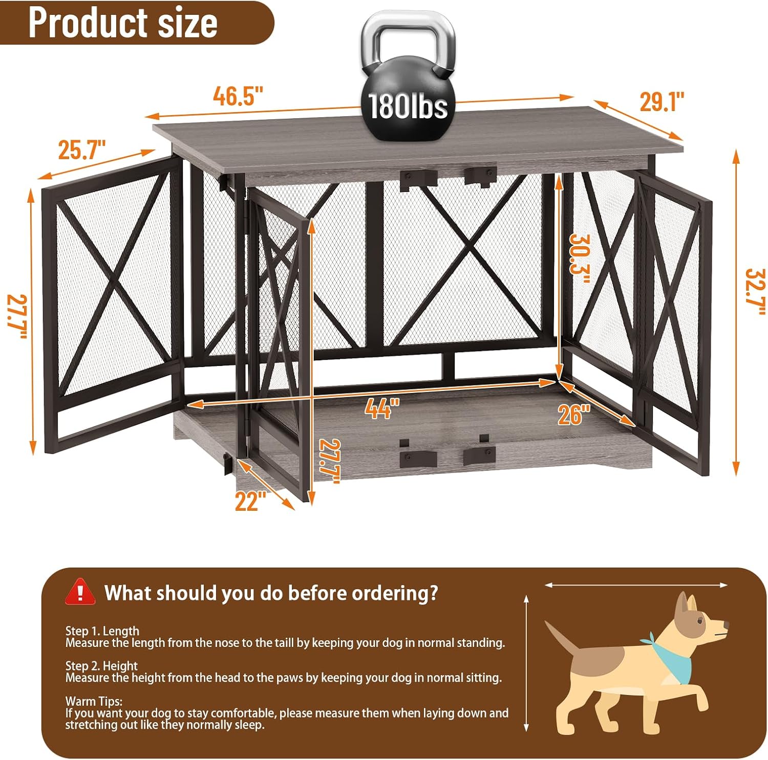 - Spacious Dog Kennels - Measuring 46.5"L x 29.1"W x 32.7"H, this wooden dog crate furniture provides ample space for all breeds, from small to large. This dog crate is designed for large dogs and extra-large dogs, offering enough room for your pet to comfortably relax and move around. With double doors on the side and front, this dog crate furniture is perfect for indoor dog kennels and crates., ensuring a cozy yet spacious living environment for your furry friend.