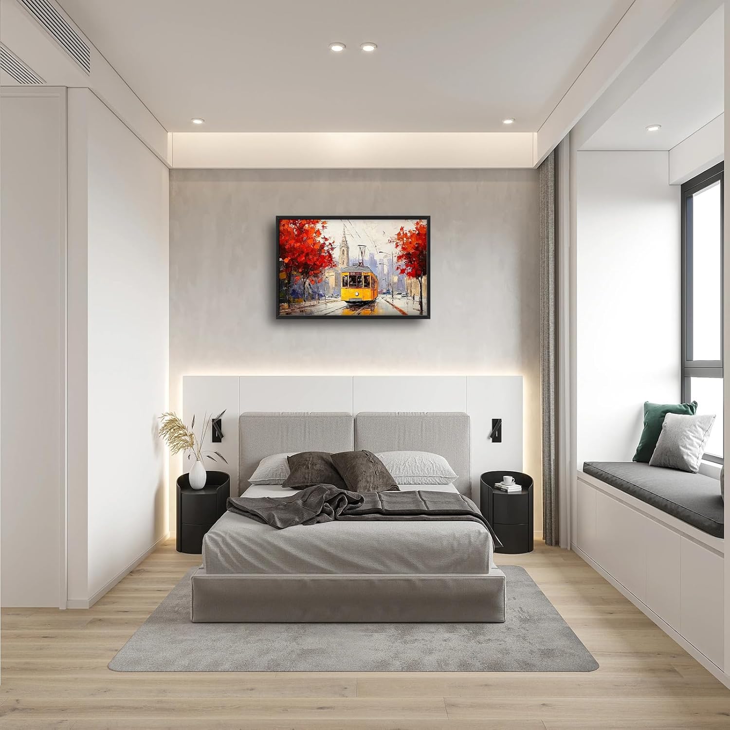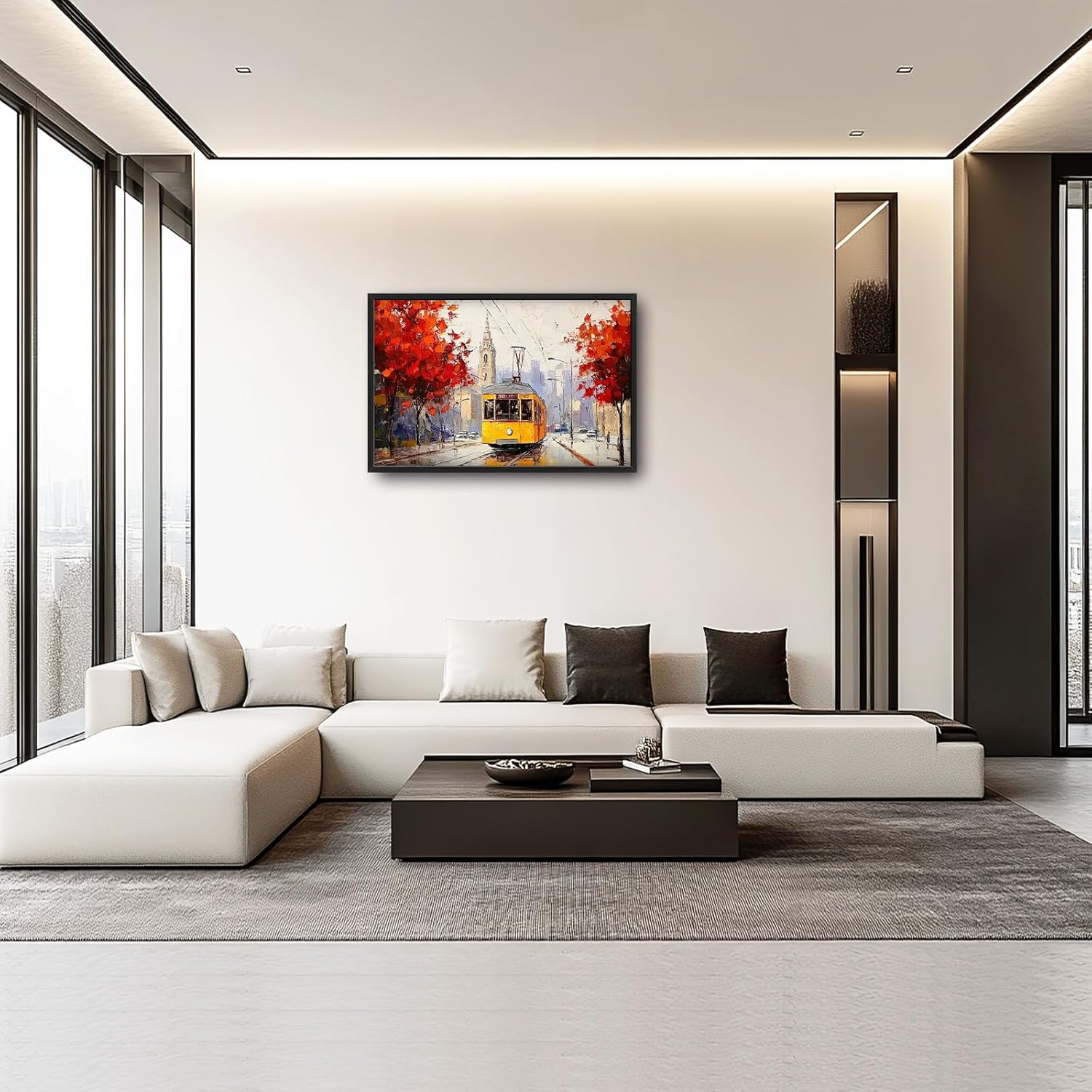 Large Cityscape Wall Art for Living Room, Framed Oversized Urban Tram Wall Decor Tree Landscape Canvas Painting Modern Artwork for Living Room Bathroom Bedroom Office Dining Room 36"x24"