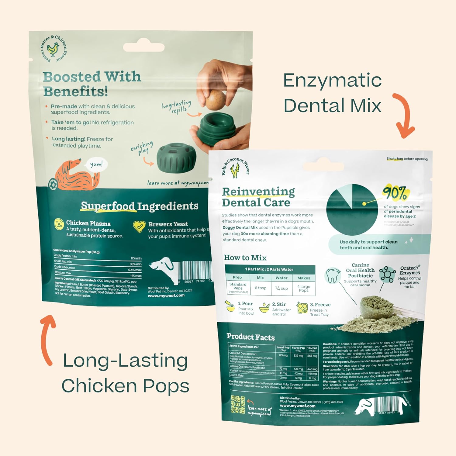 - The Daily Dental Solution: These dental dog pops are made with postbiotics to help maintain a healthy oral biome. Offer your dog a daily pop to support dental health and provide nourishing enrichment.