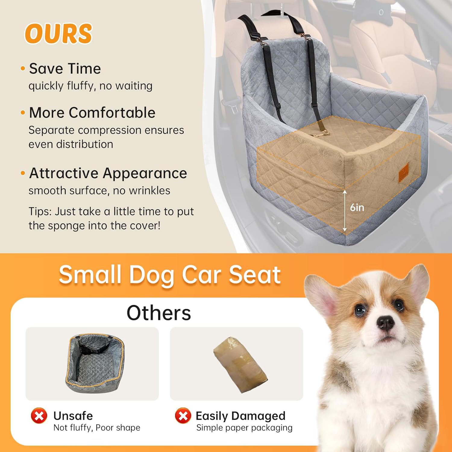 • [Booster Car Seat for Dogs]: Featuring a 6-inch elevated cushion, this pet car seat gives your furry friend a secure and comfortable ride while letting them enjoy a clear view of the outside world. Perfect for reducing travel stress and keeping your pup calm and happy on the go