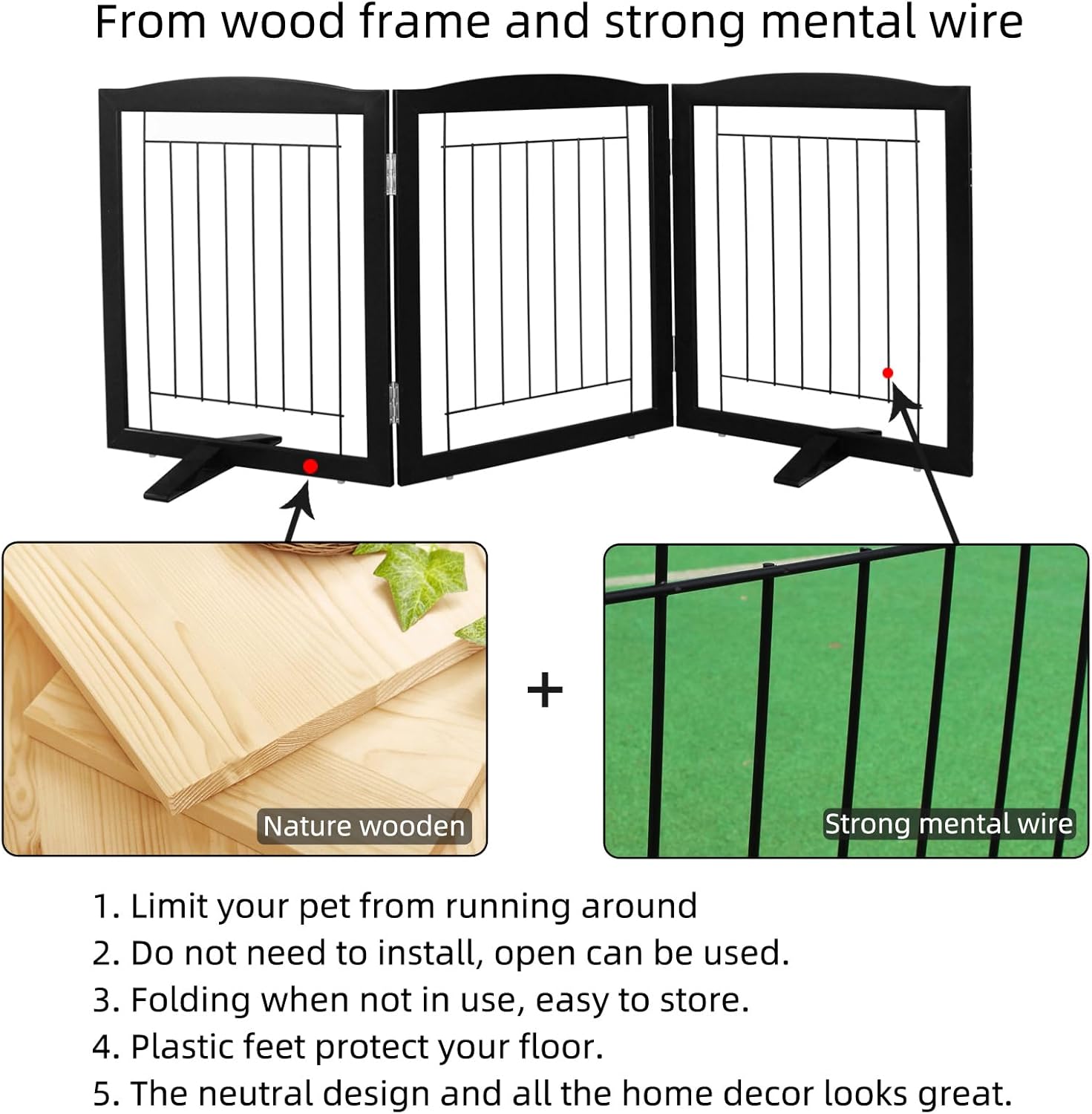 ZJSF Freestanding Dog Fence Indoor, Foldable Dog Gate for Doorways, Stairs or Hallways, Sturdy Wood Extra Wide Pet Gate with Support Feet for The House, Black, 32 "Height-3 Panels