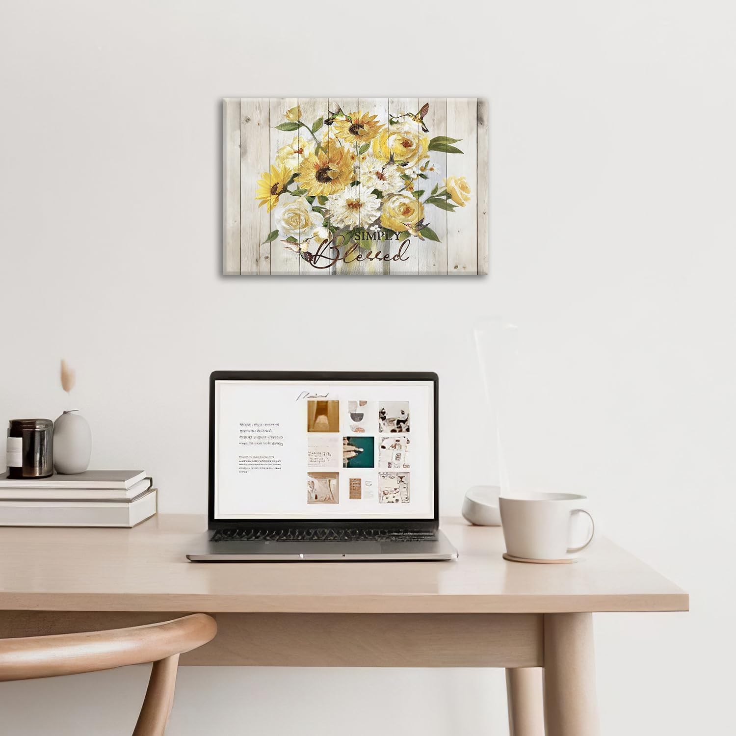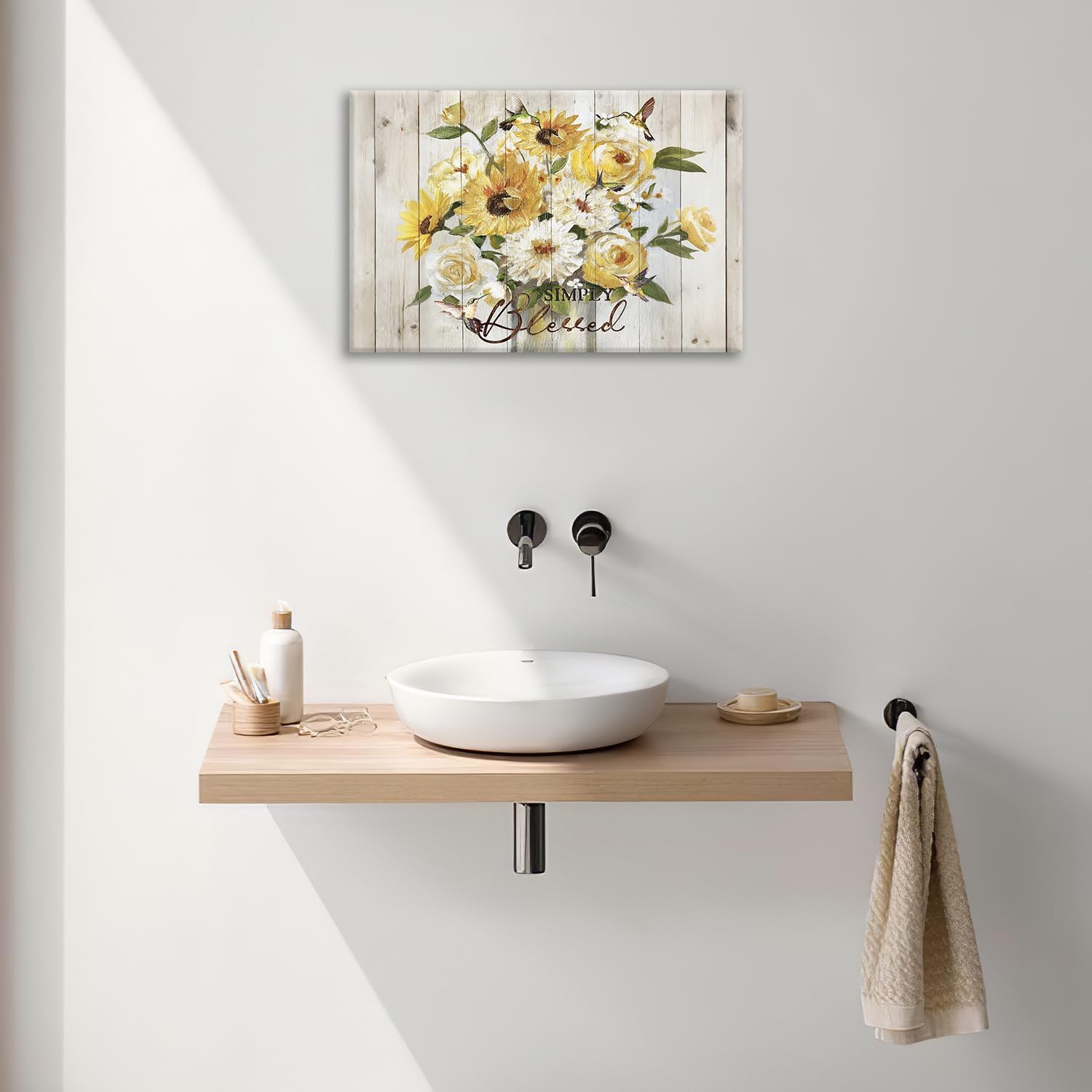 Sunflower Bathroom Pictures Wall Art, Simple Blessed Floral Bathroom Wall Decor, Flower Framed Painting Canvas Artwork for Bedroom Living Room Decorations 24"L x 16"W