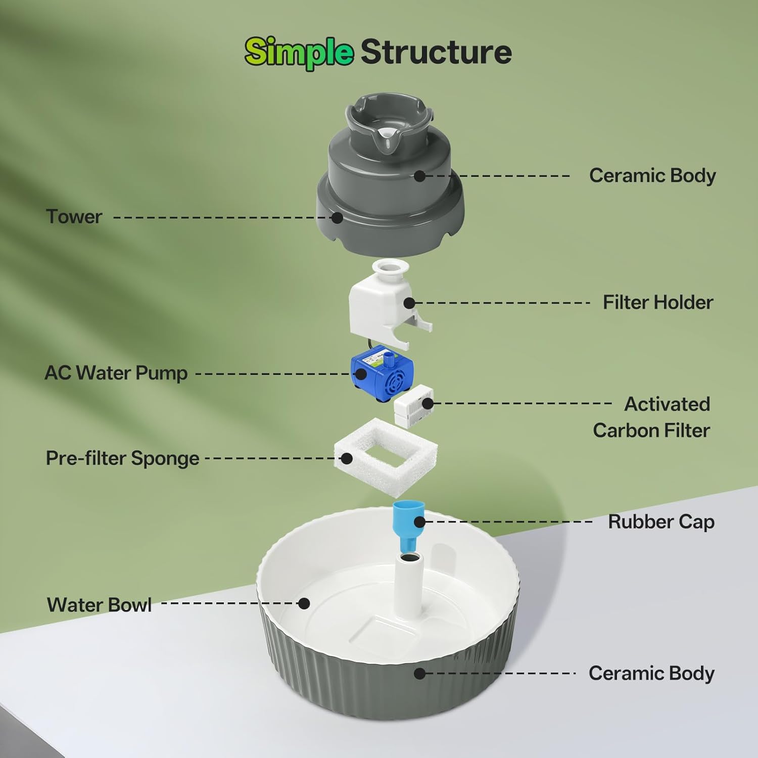 • 😽【Multi-Filtration, Water Purification】: Equipped with activated carbon filter and pre-sponge filter, which can remove sediment, debris and pet hair, this ceramic pet water dispenser can provide a constant supply of flowing purified water. Note: It is healthier to change the filter every 4 weeks!