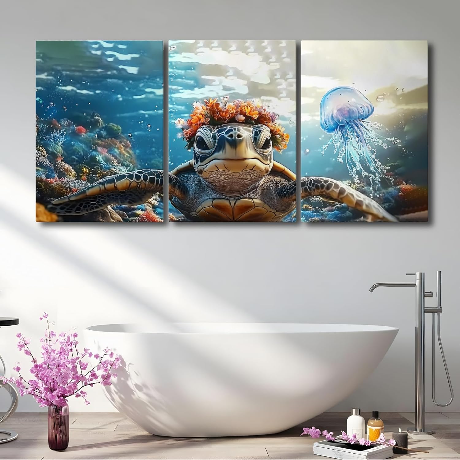 Wivsev Sea Turtle Canvas Wall Art,Under Sea Wall Art,Sea Life Pictures Wall Decor,Ocean Animal Painting for Bathroom,Living Room,Bedroom (12" x 18" x 3 pcs)