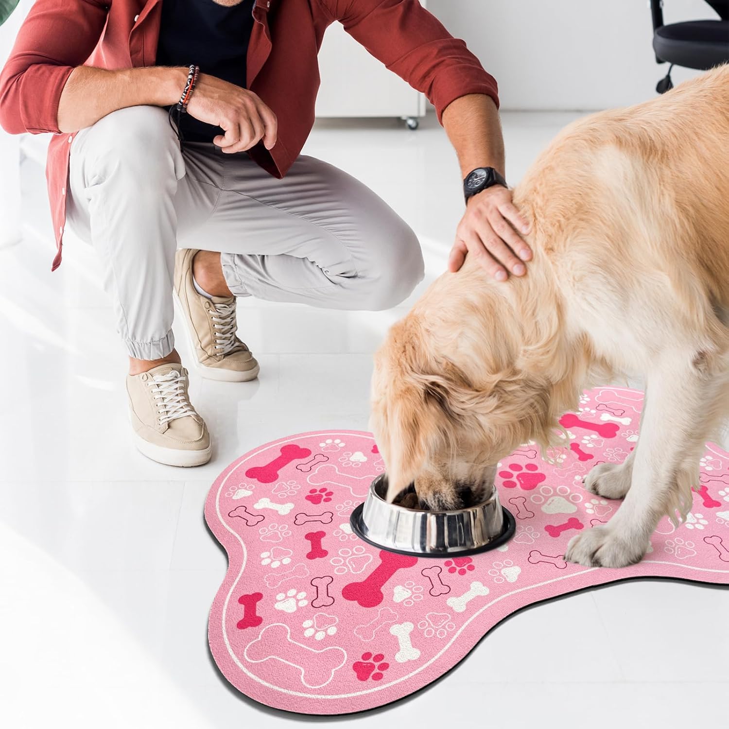 - CUTE AND FASHIONABLE DESIGN: Our pet feeding mats are designed with dog paw and bone motifs, very interesting. It is available in a variety of colors, sizes and shapes to provide a unique dedicated space for your pet's food and water bowls, and you can choose a style that matches your home décor.