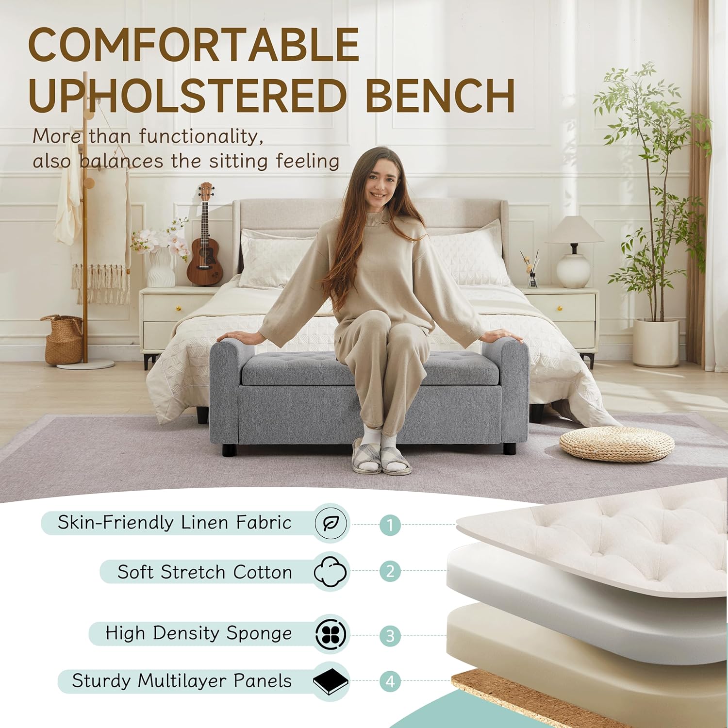 - ๐๐ฎ๐ข๐ฅ๐ญ ๐ญ๐จ ๐๐๐ฌ๐ญ ๐ฐ๐ข๐ญ๐ก ๐๐๐๐ ๐๐ฅ๐จ๐ฐ-๐๐ฅ๐จ๐ฌ๐ ๐๐ข๐ง๐ ๐๐ฌ-Crafted with sturdy frame and base, this upholstered bench provides reliable support for seating up to 330 lbs. The slow-close hinges prevent the lid from closing suddenlyโperfect for households with pets. The smooth, quiet mechanism also prevents wear over time. Whether you're sitting, storing, or just admiring its beauty, you can count on this bench to deliver lasting comfort, safety, and stability with long use.