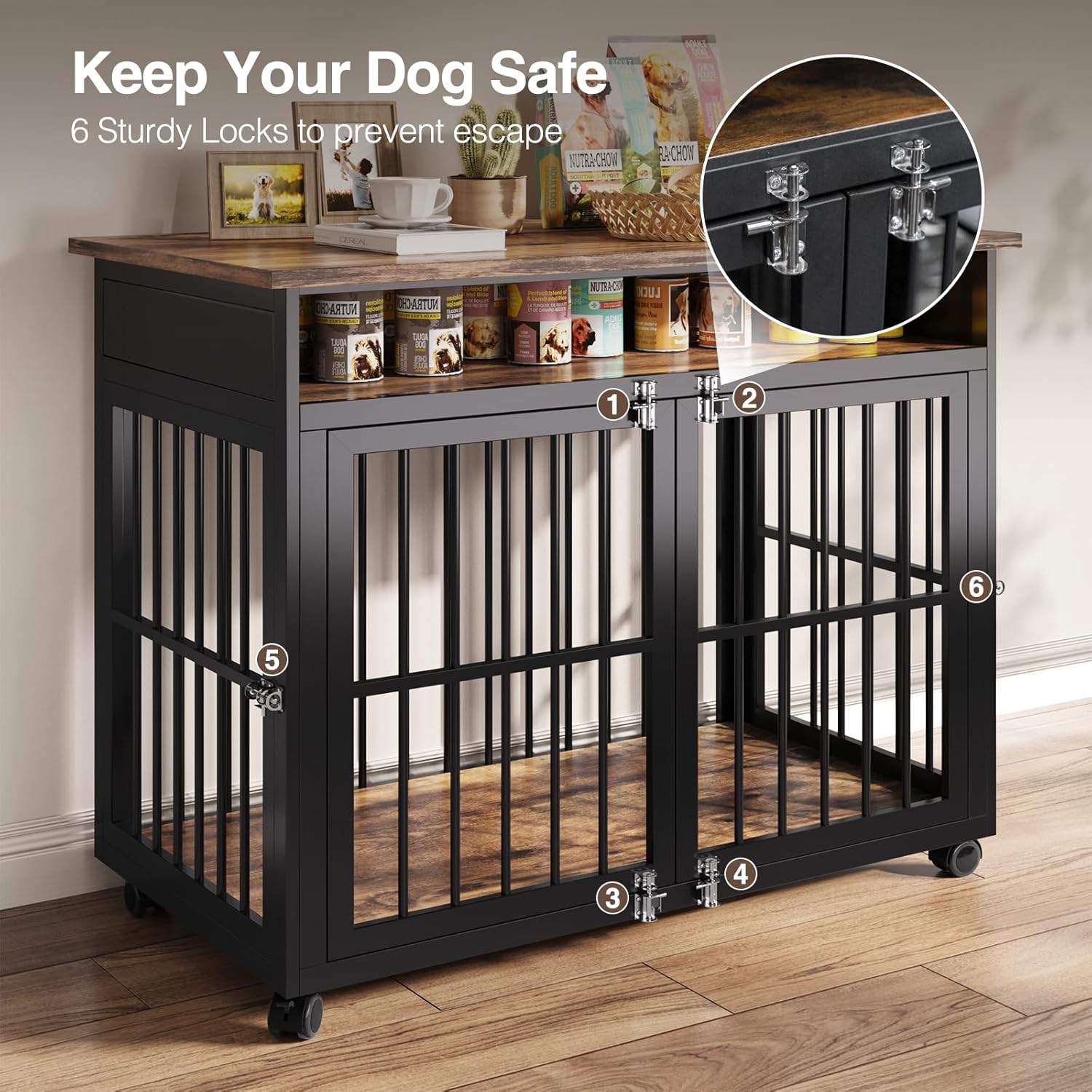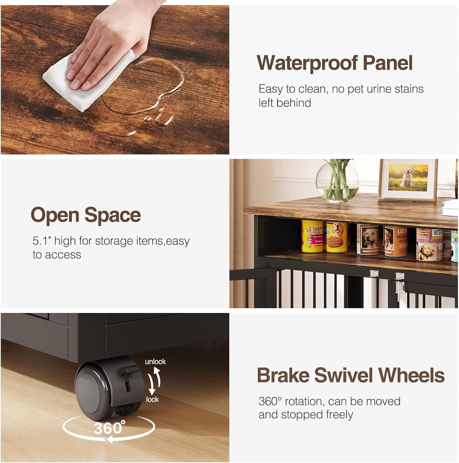 - Furniture-Style Dog Kennel:With a storage shlef, it serves as both a stylish dog crate and a practical side table. It provides space to store dog supplies and decorate your house at the same time! Equipped with 360° lockable wheels, you can easily move it around your house for different needs.