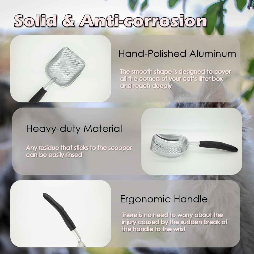 - HAND-POLISHED ALUMINUM - The bigger scoop lets you pick up more at one time & holes are big enough to sift the clean litter out easily. If you do have stuck clumps, the sharp edge & sturdiness of the scoop clean them right of the sides & bottom