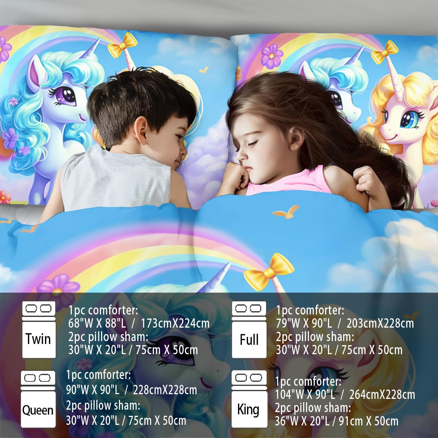 - Twin Size Rainbow Unicorn Comforter Set :This bedding set includes 1 comforter(67" x 85") and 2 pillowcases(20”x30”). In order to facilitate transportation, the quilt is made of vacuum compression technology. It will be slightly wrinkled when taken apart, but it will quickly regain its fluffiness if you gently beat it.
