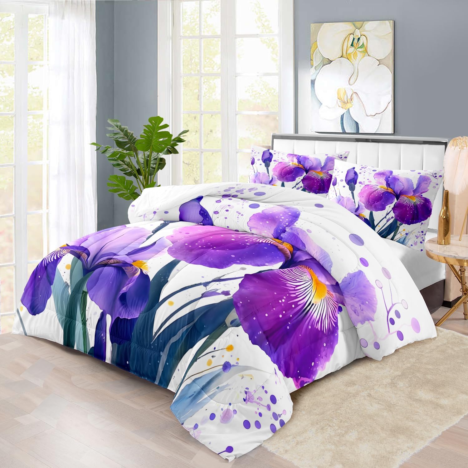 - Queen Size Floral Iris Comforter Set :This bedding set includes 1 comforter(67" x 85") and 2 pillowcases(20”x30”). In order to facilitate transportation, the quilt is made of vacuum compression technology. It will be slightly wrinkled when taken apart, but it will quickly regain its fluffiness if you gently beat it.