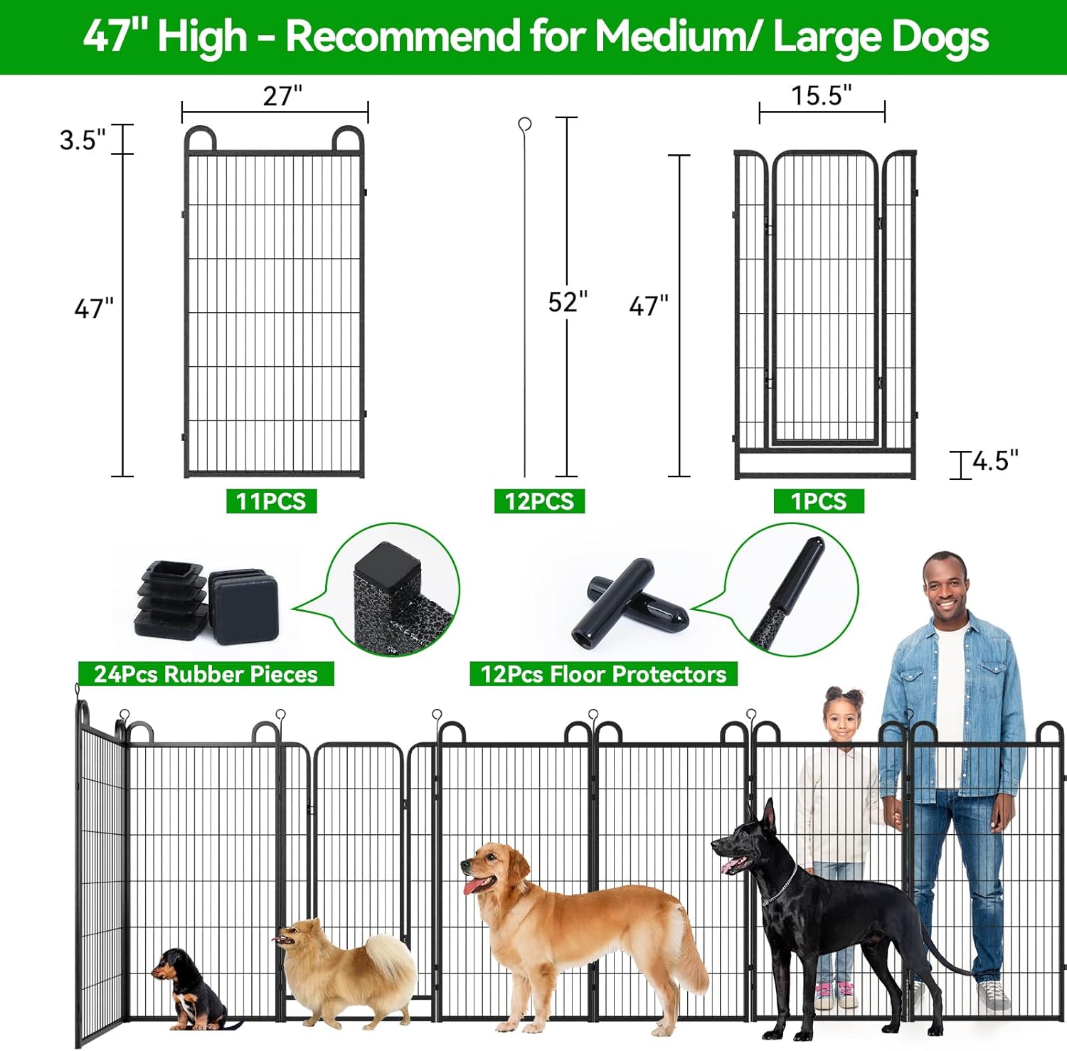 Dog Playpen Outdoor 12 Panels Heavy Duty Dog Fence 47" Height Anti-Rust with Doors Portable for RV Camping Yard, Total 27FT, 58 Sq.ft, Snowy Black
